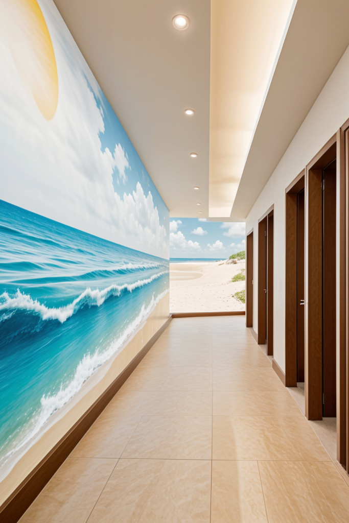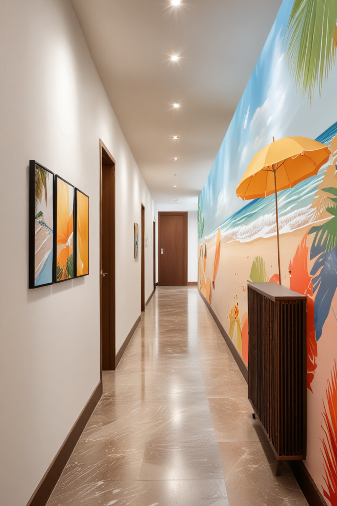 Elevate the theme of your interiors using summer-themed mural wall art that depicts sun-kissed beaches, abstract designs, and beautiful sceneries. These masterpieces enhances the beauty of these hallways, transforming them from lifeless portraits into vivacious depictions of life. Not only do they put a smile on your face, but also bring a fresh vibe into your house.