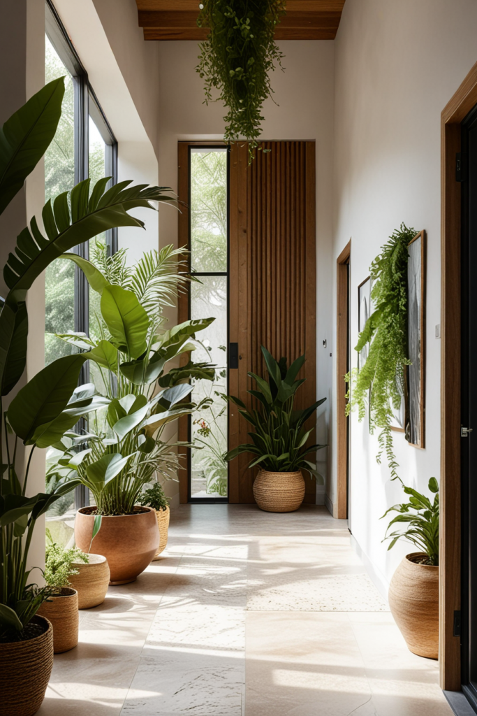 Ingrating natural space to your hallway can turn it into a relaxing getaway. Adding potted plants, wood accents, and stone decor can achieve a summery, refreshing feel. The subtle interplay between the greenery and natural elements like woods and stones provides a break from the monotonous routines of everyday life.