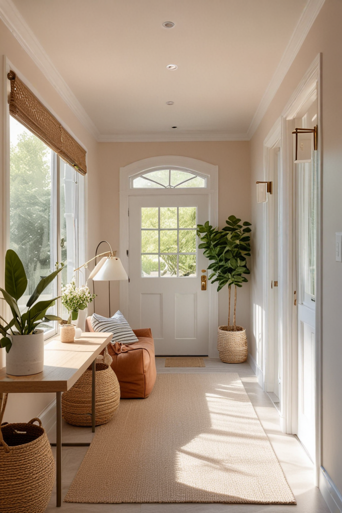 Preserving an organized and welcoming entrance cultivates a calm, uncluttered environment. Along with clean and organized storage, a minimalistic decor approach guarantees order and calm tranquility during design processes. During summer, with appropriate decorations and thoughtful storage solutions as well as consistent streamlined decor around the empty hallway, the environment would be ideal.