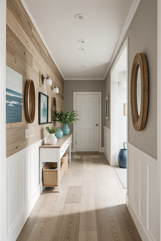 A beach-inspired style can be achieved by adding shell and sand motifs in your design. These elements derive from nature, allowing you to achieve a serene yet sophisticated look. Placed in bowls or mounted on walls, these details transform your hallway into a multi-sensory experience.