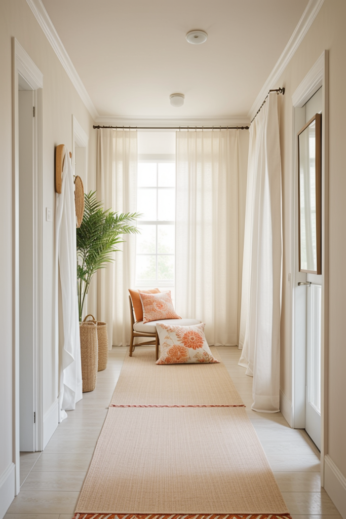 Enhance your summer hallway decorations by incorporating summer textiles that warm up your entryway while adding some texture. These textiles include light curtains, throw pillows, and soft runners which welcome guests in style. The textile colors and fabrics are inviting to the eye as well as showcase the charm of the summer season.