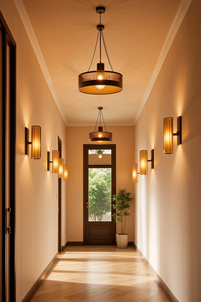 Set your hallway aglow with warm lighting and add visual appeal to pendant lamps or other wall lights. Modern light fixtures, like these, not only serve aesthetic purposes, but also emphasize significant design features. Their warm light makes the environment cozy during summer evenings while serving a practical purpose as well.