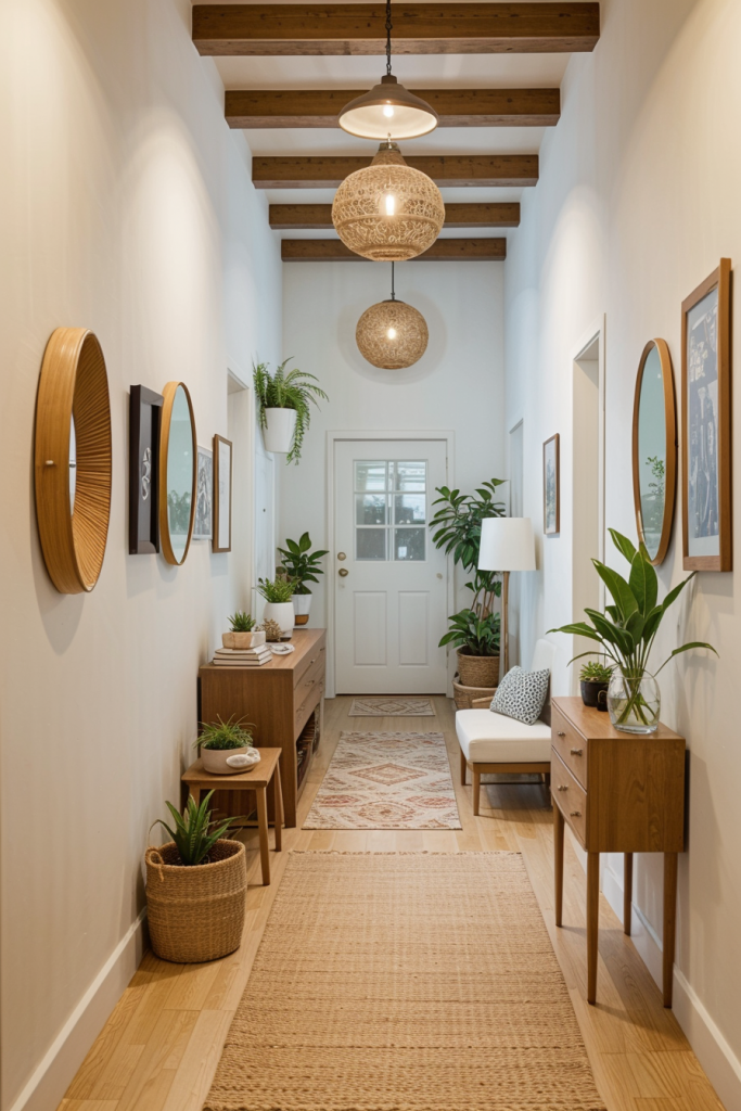 Incorporate decorative mirrors into your hallway to enhance depth perception and light reflection making it appear brighter and more open. Stylish mirrors can be modern framed or artistically designed enhancing the beauty of the space. Not only do they enhance the summer decor with elegance, but they also increase the natural light in the space.