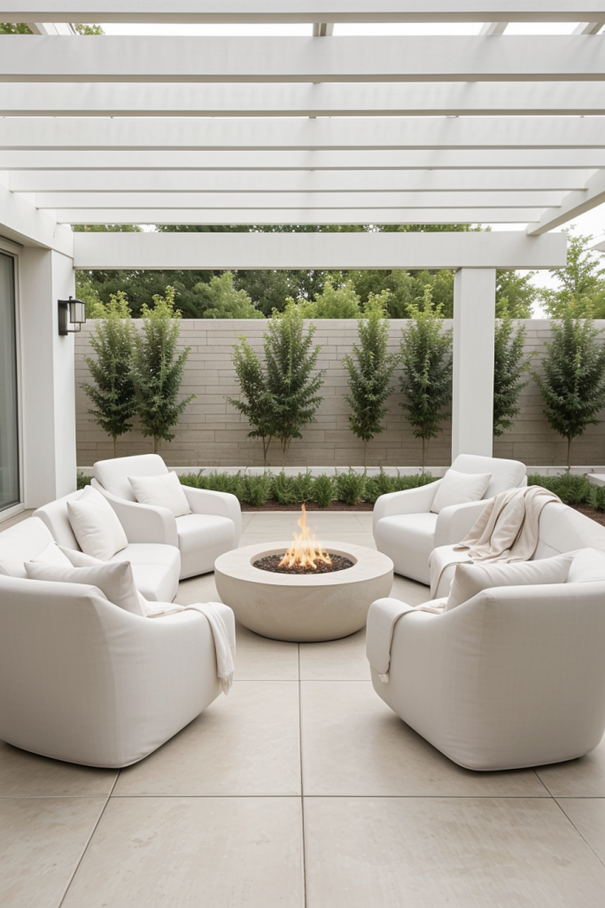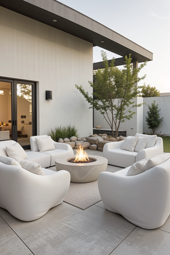 Making an impression with a contemporary patio does not require the use of striking colors. Sculptural outdoor furniture in off-white or taupe and a subdued fire pit enhance the beauty of the outdoor space. Add stone-colored cushions and linen throws for soft fabrics, and combine these with warm-toned lanterns and subdued planters. Accessorize further with outdoor rugs and cushions. The end results is a serene atmosphere made better for relaxation or dining.