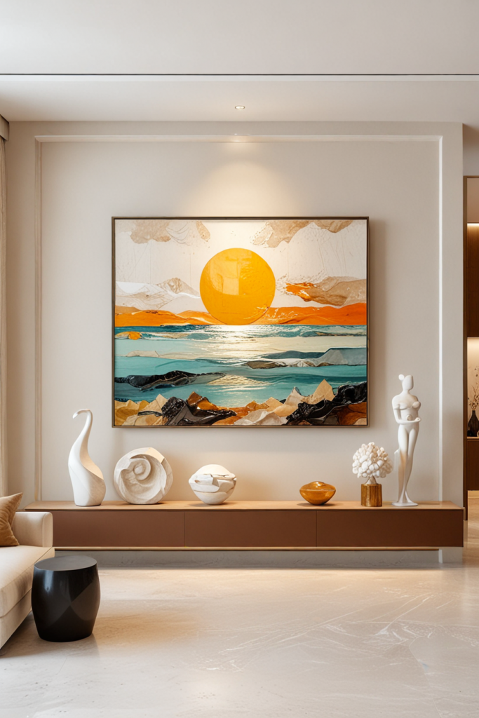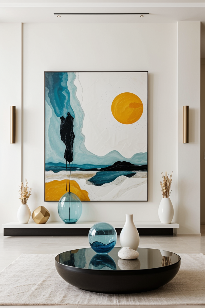 Substitue serious or dark paintings with lighter, summer-themed abstract coastal art. Sculptures made of plaster, glass, or brushed metal display calm elegance. Pick sculptural artworks that have soft organic forms in stark colors or gentle hues that add interest without being too visually loud. Proper illumination enhances or transforms even the most simplistic accent art.