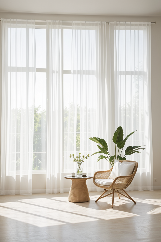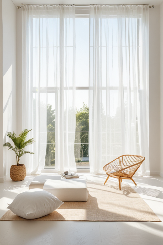 In summer, sunshine is the best companion, but it can be enhanced or softened by window treatments. Sheer curtains and light linen drapes let soft natural light filter into the room. Avoid heavy drapes and go for clean, modern looks, using sleek neutral shades or motorized systems. Combined with white walls and reflective surfaces, the light becomes glowing and serene.