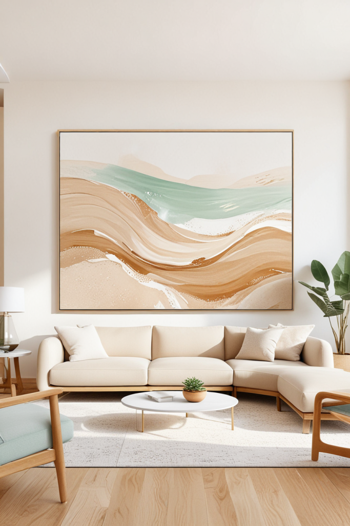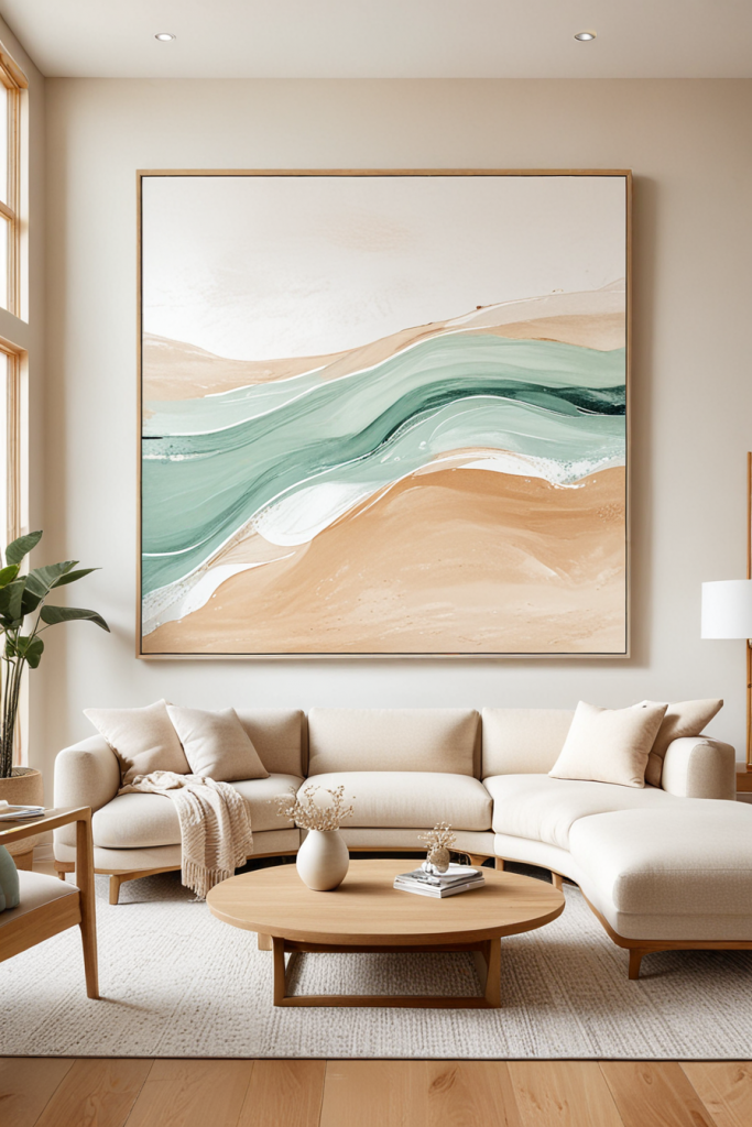 Abstract wall art adds character to a modern summer living room. Select pieces with flowing shapes or muted tones like sand and seafoam. Brushstroke patterns that resemble the watercolor technique work well too. Large canvases capture the eye and at the same time do not make the room seem cramped. Natural wood or white enhances and captures sophistication.