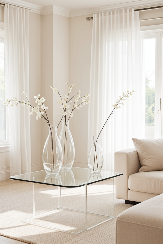 Decor made with glass and other transparent materials creates a beautiful interplay of light and promotes an airy feel to the space, making it ideal for a summer home. Add modern layers with low visual weight using laced side tables, smoked glass vases, or transparent vases. Elevate the sophisticated charm of the home by including clear shelving. For a fresh but peaceful design, combine these glass decorations with white, beige, or pale wood tones.