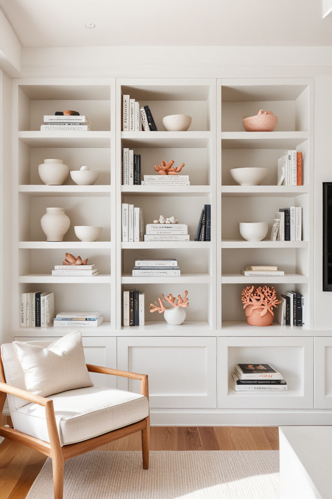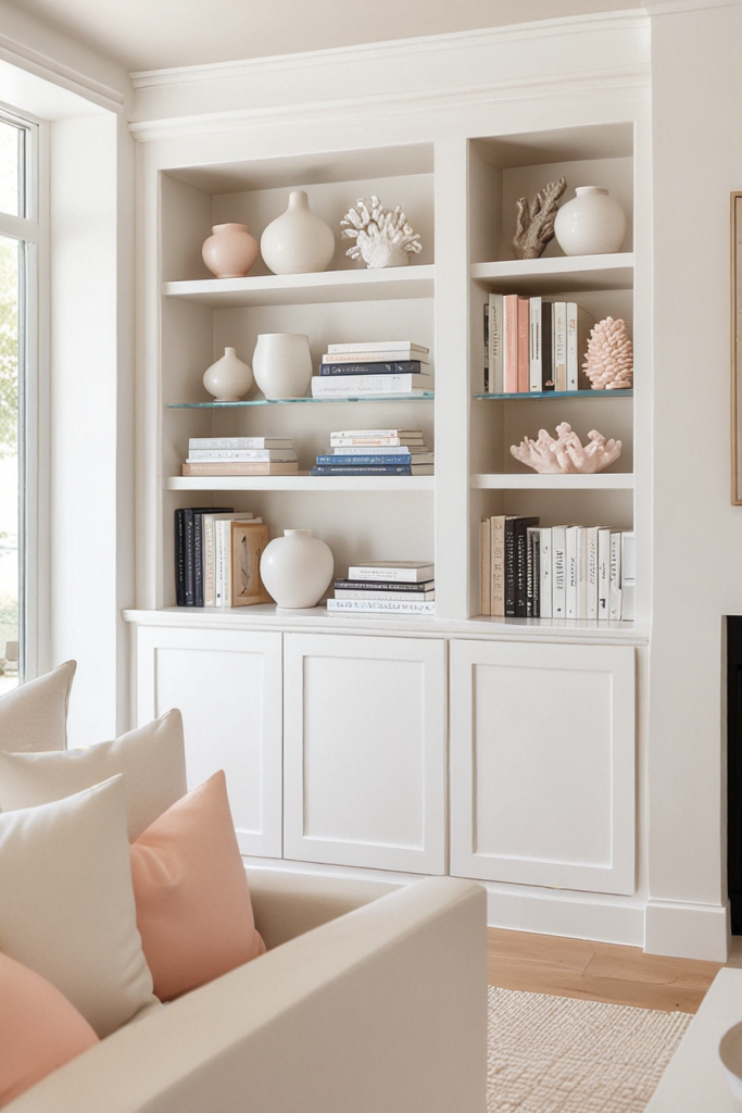During summer, shelf styling requires more white space. Incorporate a gentle mix of designer books, coral and soft stone pieces, ceramics, sculptural objects, and gentle hints of seasonal changes. Remember to use soft white, light sand, and light gray colors to create a clean contemporary feel. Always leave some empty space to allow for visual rest – this is what transforms built-ins from cluttered to styled.