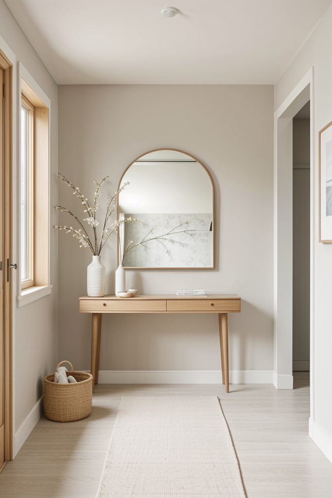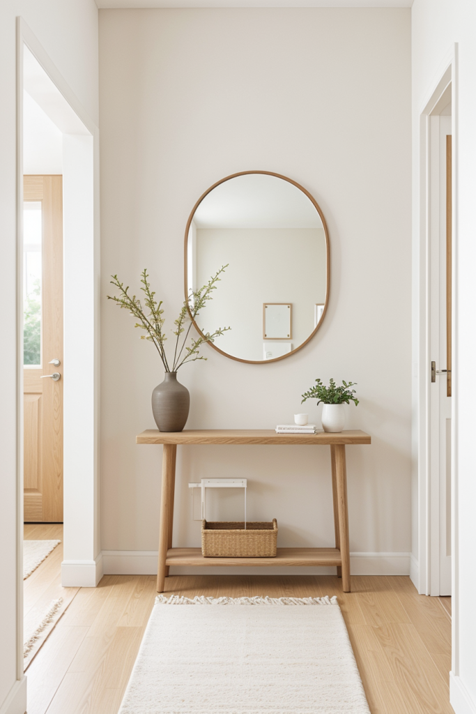 Even the tiniest of hallways can dazzle with the perfect summer design. Pay attention to detailed decor like a svelte, pale oak console, a soft sand toned abstract framed piece, and an ornate round edged mirror for added polish. Use a light runner rug, tall vases with summer branches, or sculptural wall sconces to infuse seasonal charm. To maintain an open and light atmosphere, the palette should be minimal.