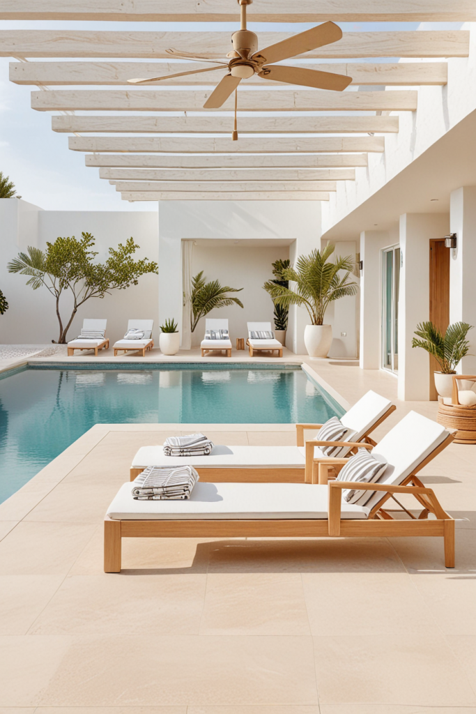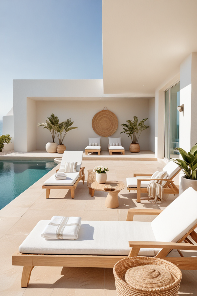 Modern Poolside Decor in White, Sand, and Ocean-Inspired Tones