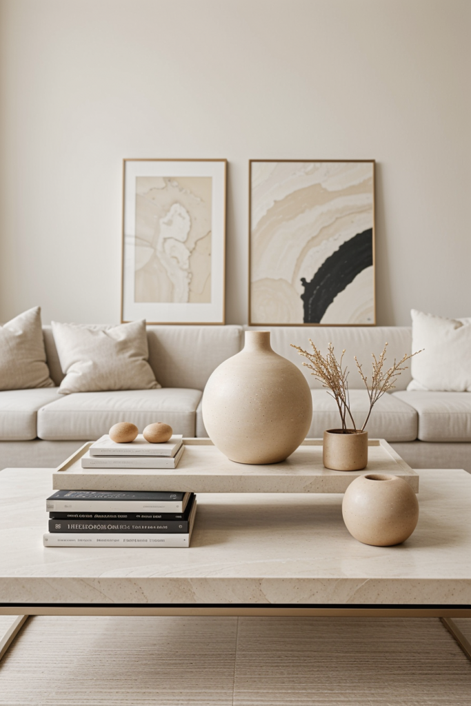 A summer coffee table requires functionality blended with elegance. One or two hardcover designer books can be stacked and complemented with a sculptural tray and soft floral or textured object. Choose travertine, wood, or smoked glass, while avoiding anything too dark or heavy. The goal is to reflect the natural light tone of the season while maintaining balance in the space.