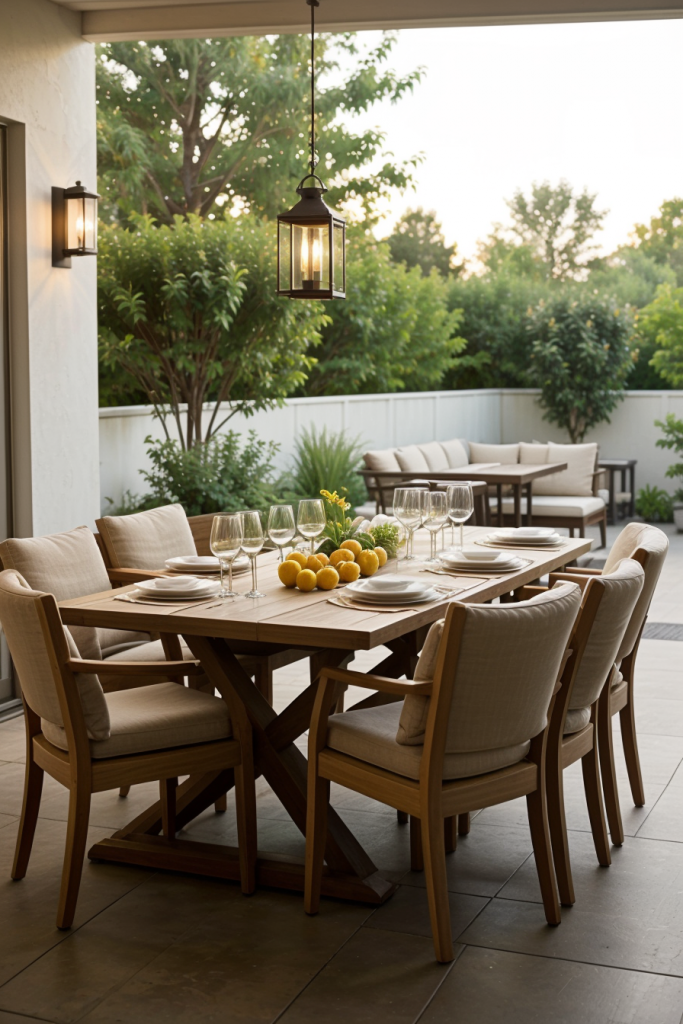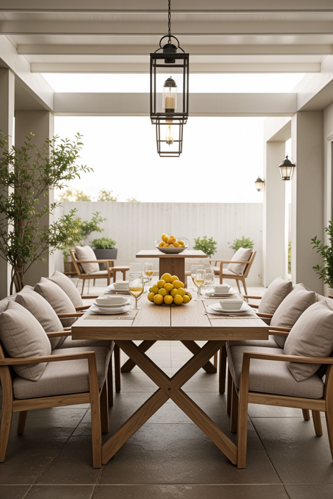 For outdoor dining, envision elegant yet simple. A light wood or metal table with cushioned neutral fabric chairs is the start. Top it off with glassware, contemporary napkins, and a sophisticated low seasonal herb arrangement or a bowl of citrus. To finish, sculptural lanterns or string lights add to the polished summer aesthetic.