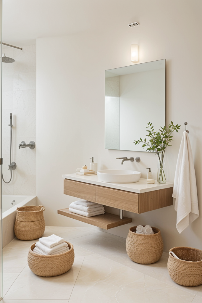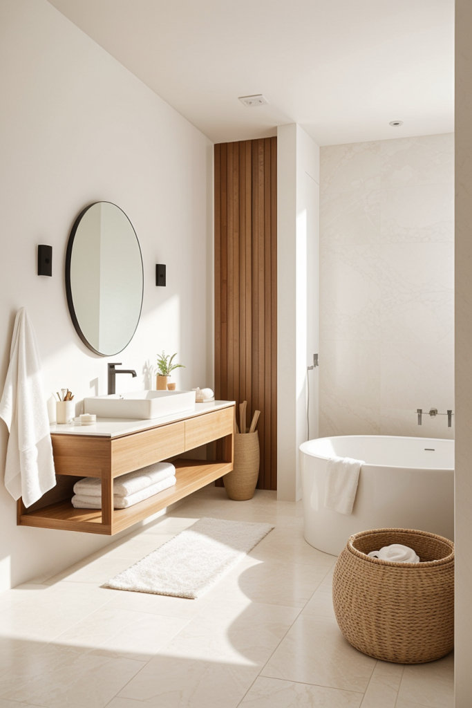 Transform your summer bathroom into a spa with stone and white finishes, soaking tubs, and wood vanities. Warm ivory towels add a touch of elegance. Baskets, marble trays, and glass canisters create soft textures in woven patterns. Sculptural decor and soft lighting, along with small plants, invite a calm modern atmosphere perfect for relaxation.