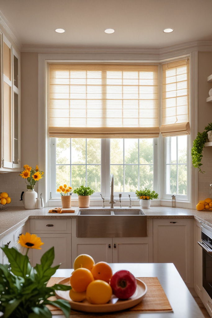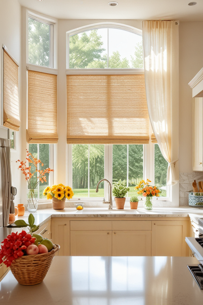 In contemporary summer kitchens, window treatments are important for maintaining style while creating an atmosphere filled with natural light. The summer kitchen décor and furnishings are brimming with vivacious colors, thus, windows can be enhanced with light filtering shades or curtains to allow light to flow through. the right choice of fabric and color also enables the window treatment to blend with the decor and at the same time gently filter the light.