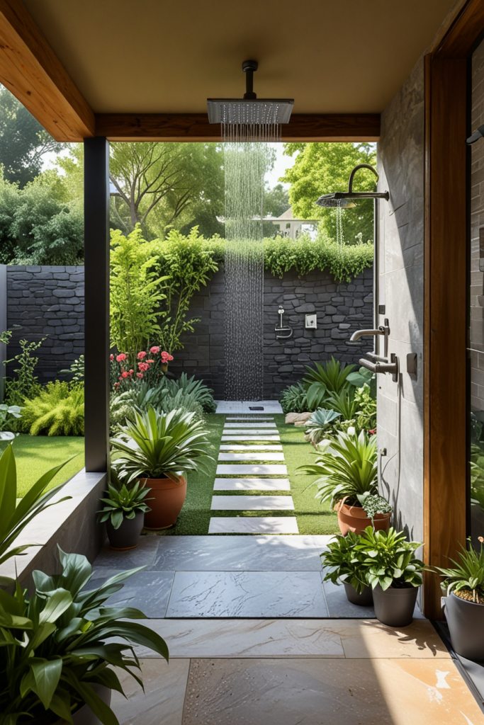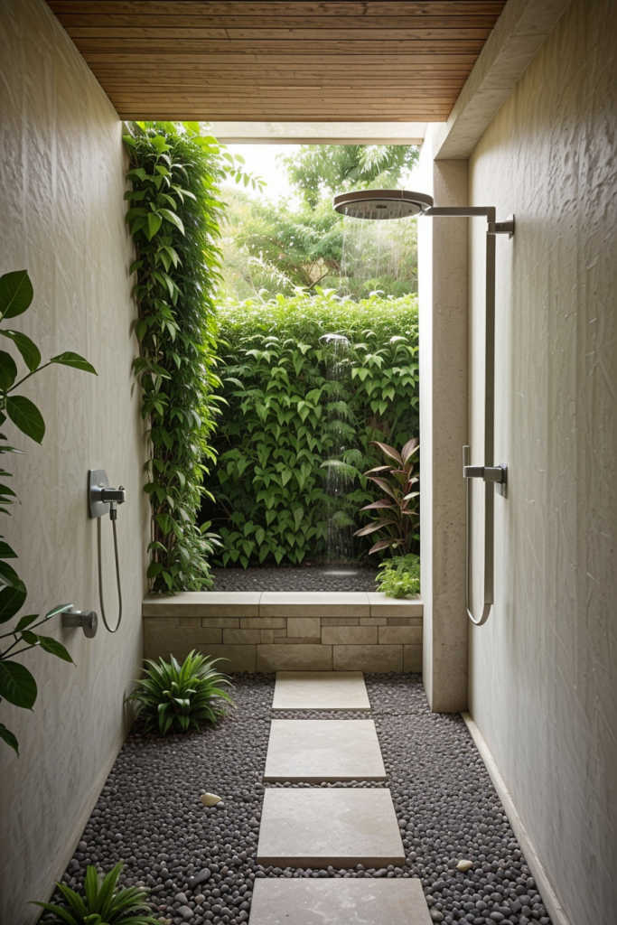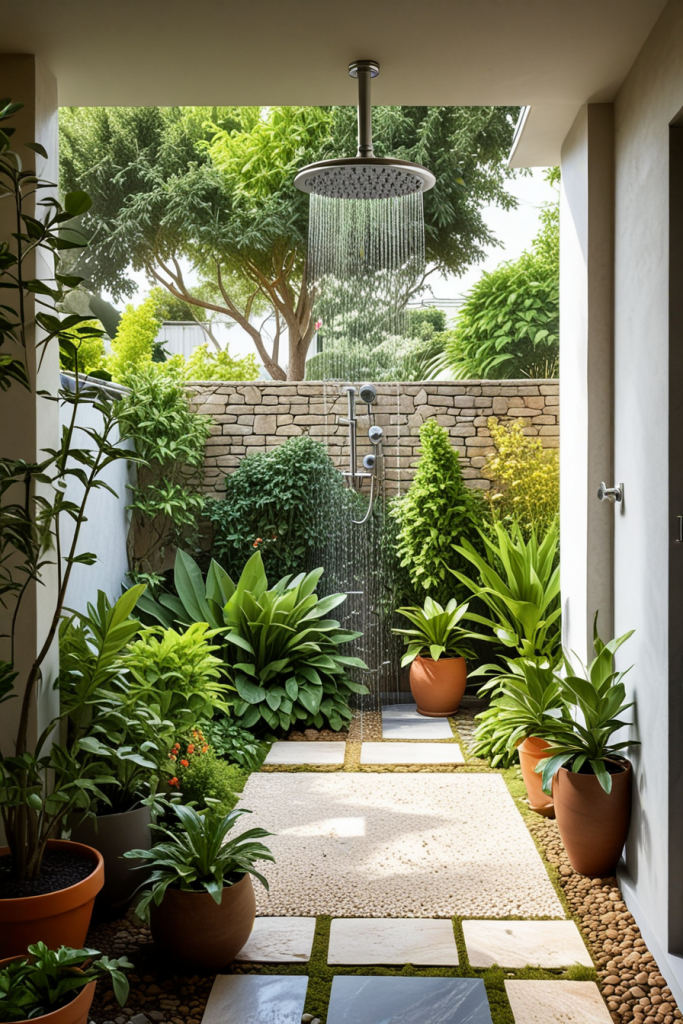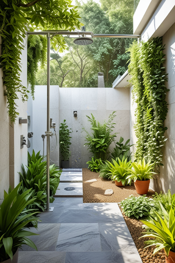 Integrating an outdoor shower with a garden gives you an environment that is calm and goes together with nature. This design includes landscaping elements such as potted plants, stones, and flowers to create an otherworldly outdoor space which brings peace. The combination of nature and modern design turns the space into a refreshing experience full of nature.