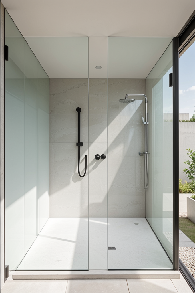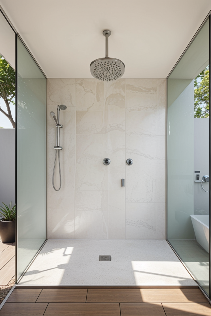 Choosing the correct materials guarantees that your outdoor shower withstands weather while retaining its modern aesthetic. In particular, this design features tempered glass, stainless steel, and outdoor grade stone, showcasing exceptional durability along with stunning beauty. Every glass is selected to withstand outdoor conditions but still maintain a contemporary aesthetic.