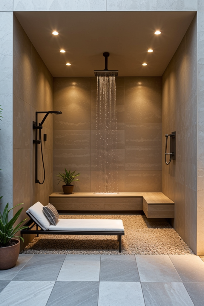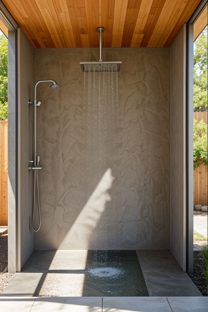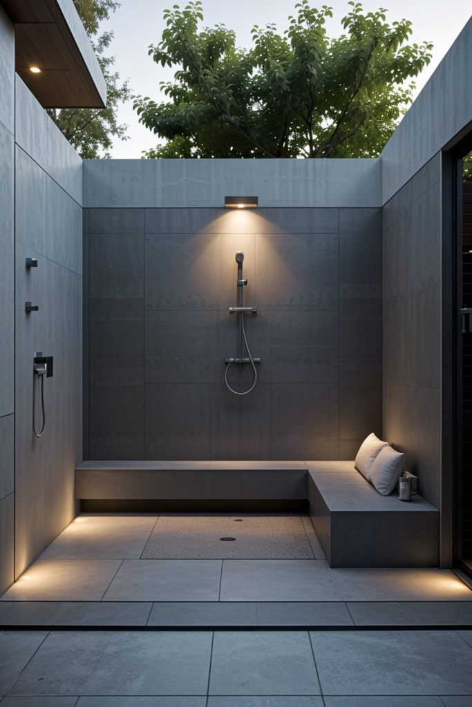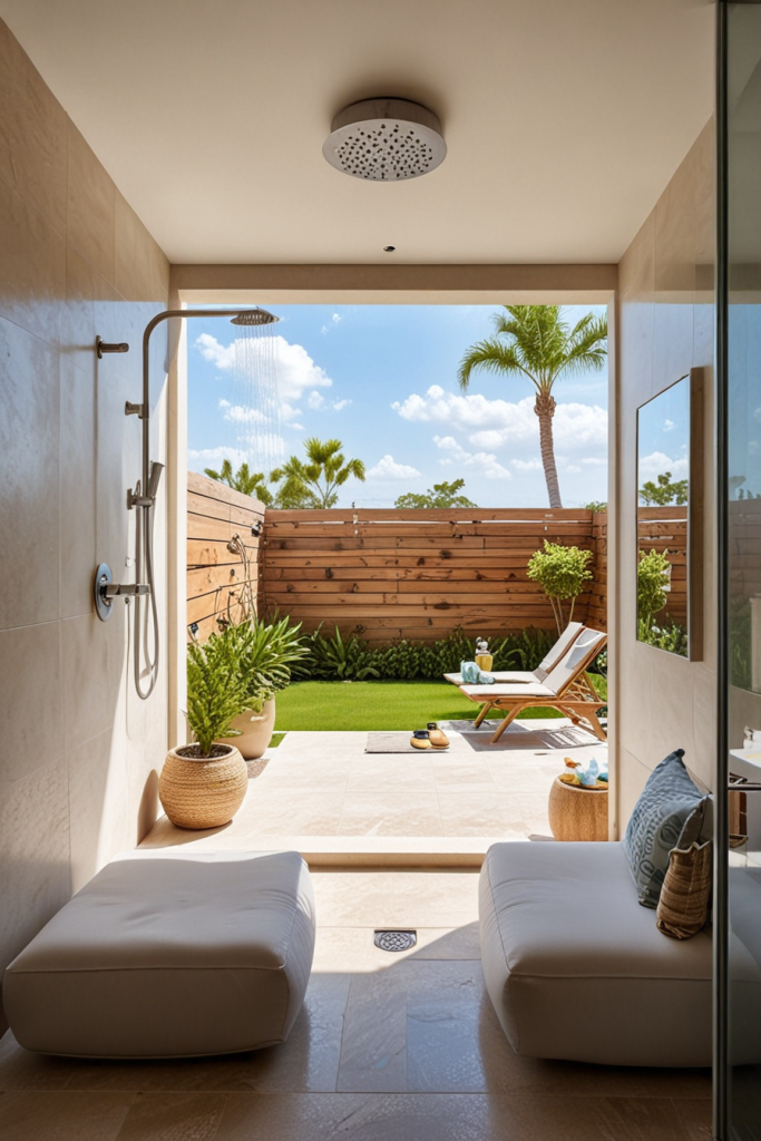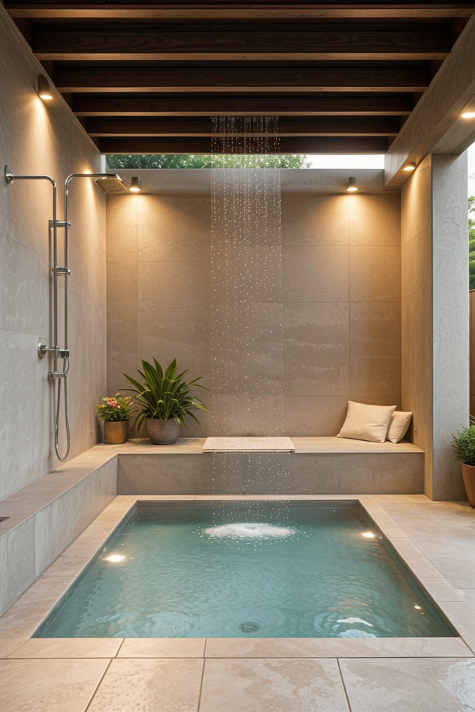 Designing a space that combines a shower and relaxation zone offers different opportunities for utilizing your outdoor area. This design provides seating that can withstand water exposure, built-in loungers, and soothing lights that offer comfort while guests unwind after a soothing shower. The design promotes summer comfort without sacrificing aid utility.