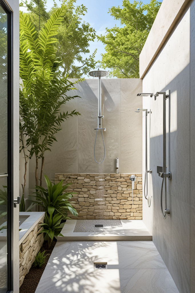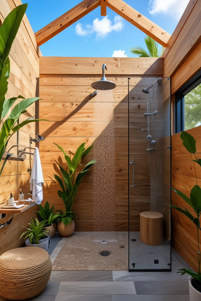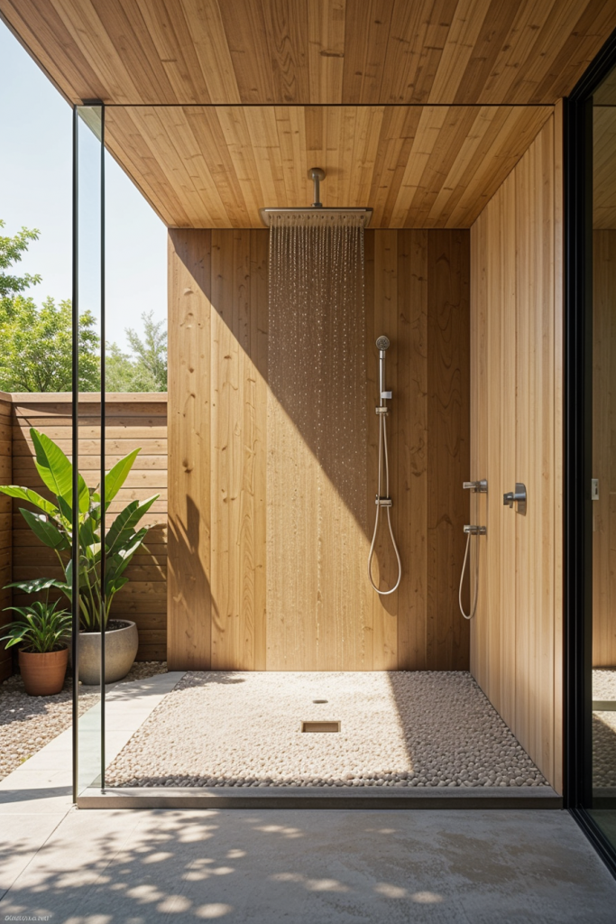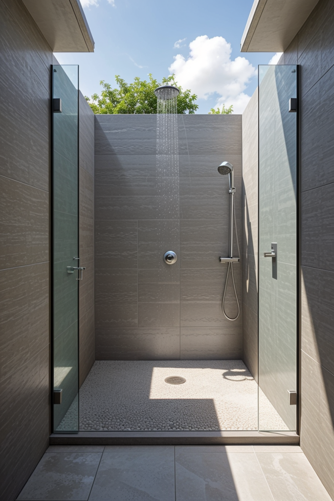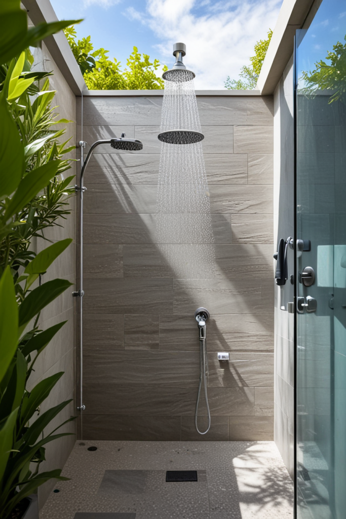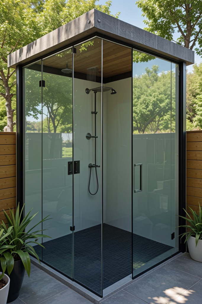 It is extremely important to have the right enclosure for both privacy and design in your outdoor shower. This design incorporates contemporary beauty with function, including glass and weather-resistant partitions to create a stunning private space. You get the best of both worlds: a balanced retreat that is relaxing and modern at the same time.