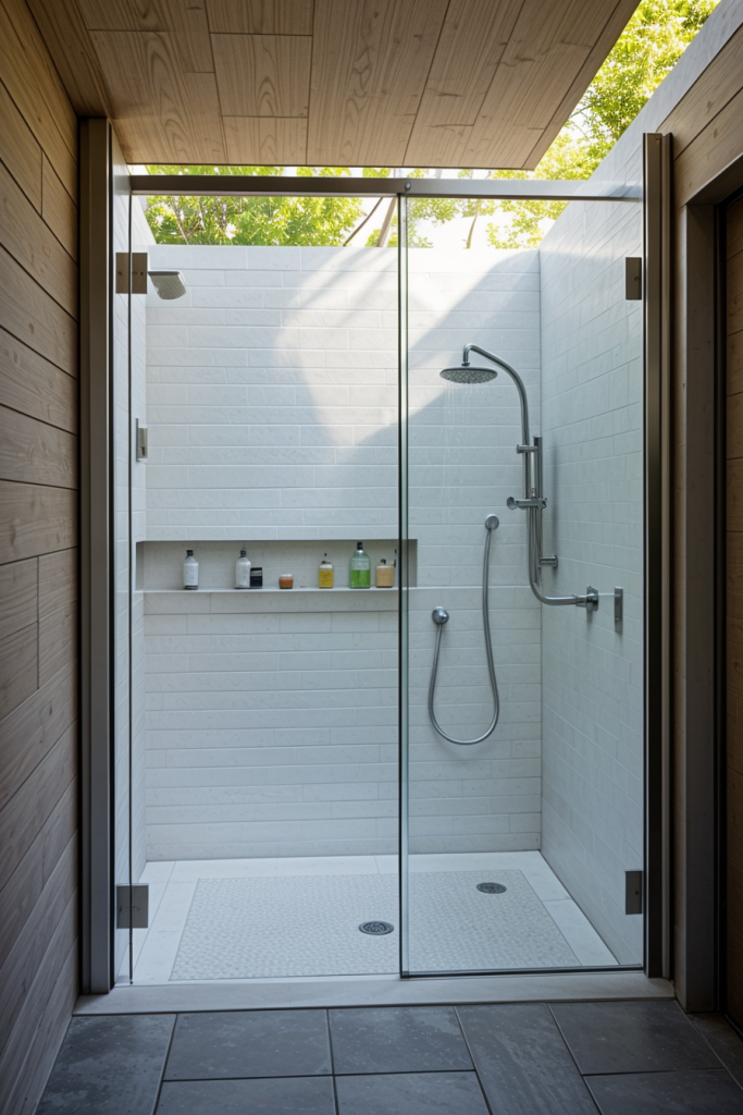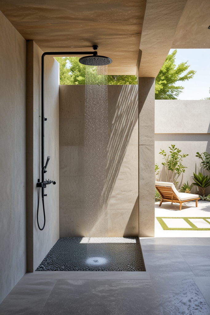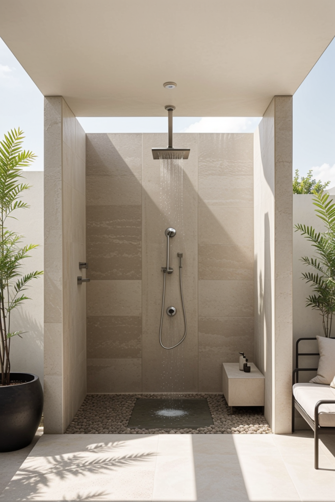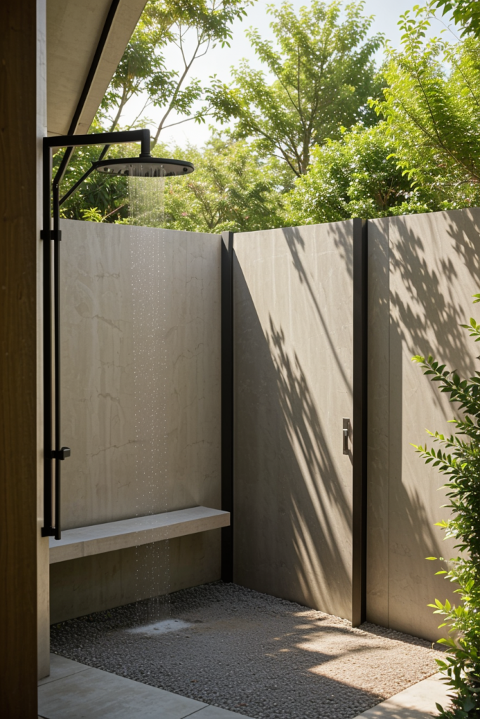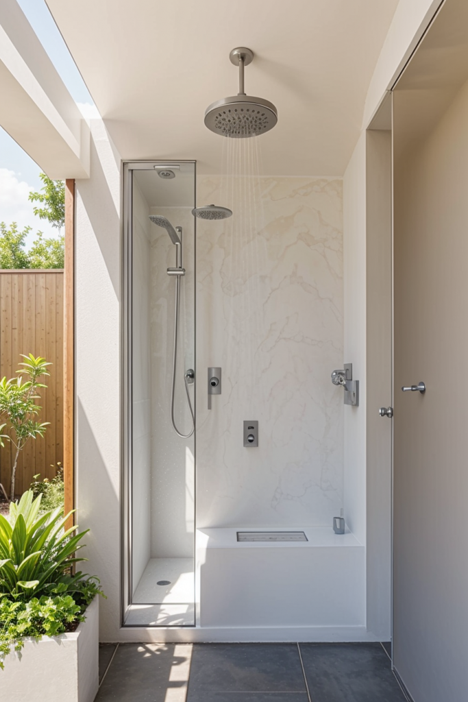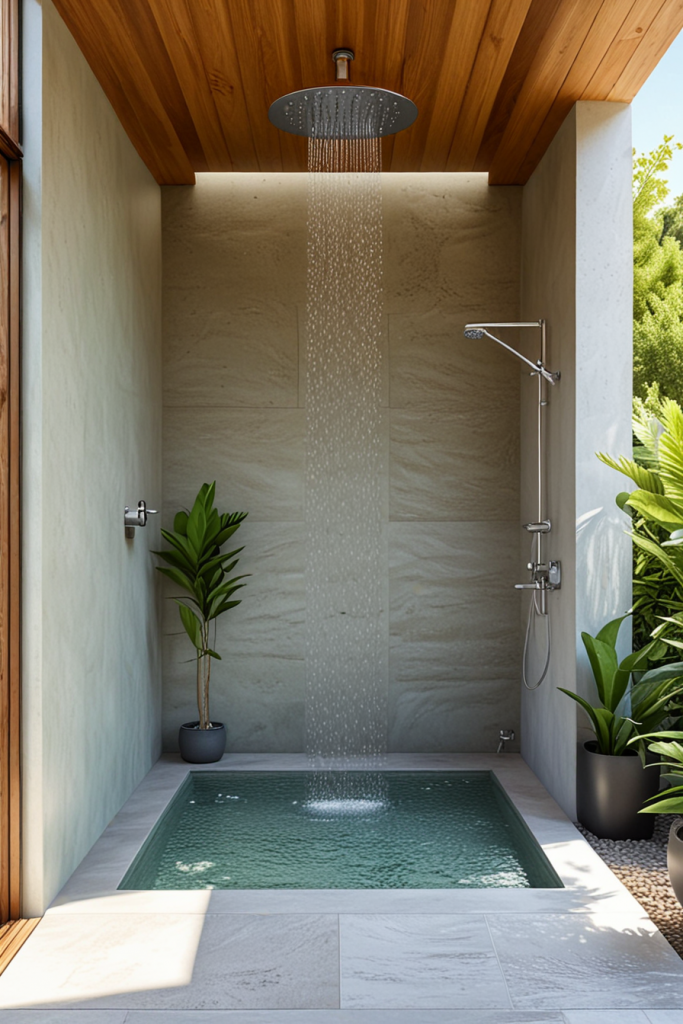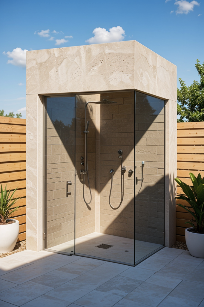 It is extremely important to have the right enclosure for both privacy and design in your outdoor shower. This design incorporates contemporary beauty with function, including glass and weather-resistant partitions to create a stunning private space. You get the best of both worlds: a balanced retreat that is relaxing and modern at the same time.