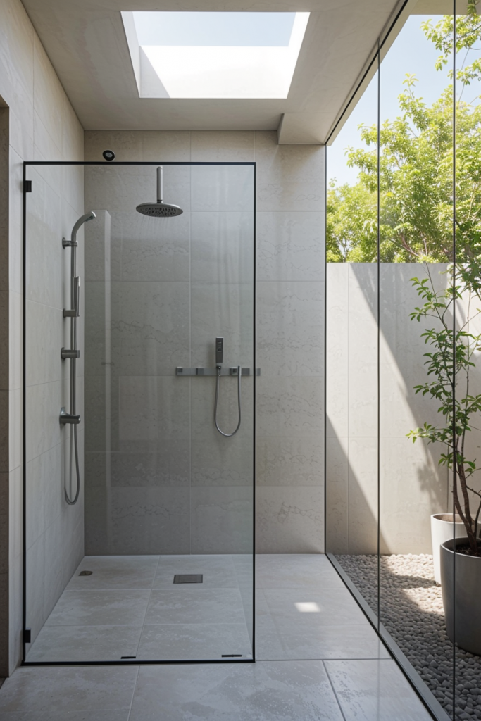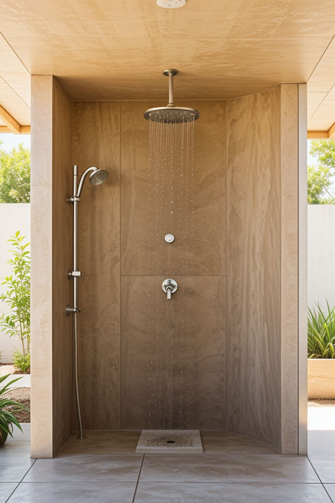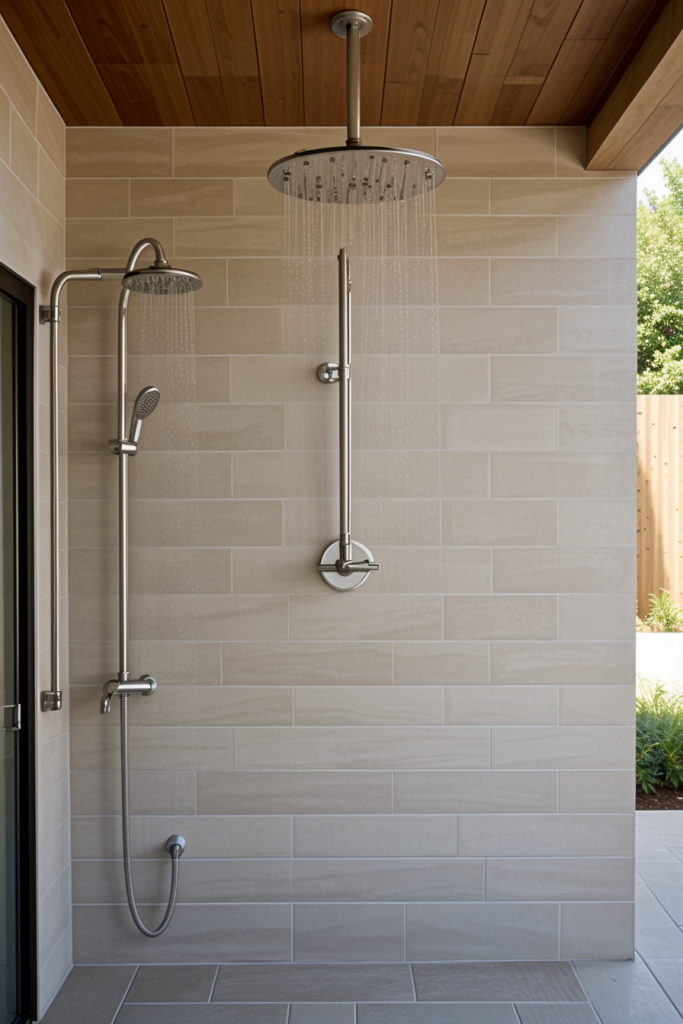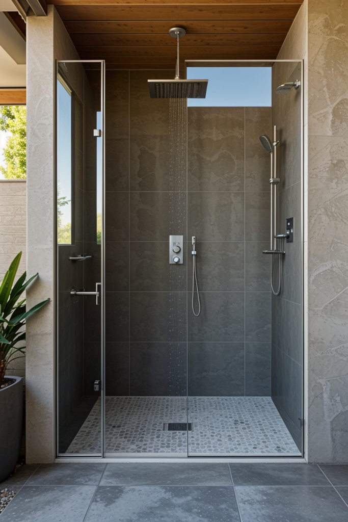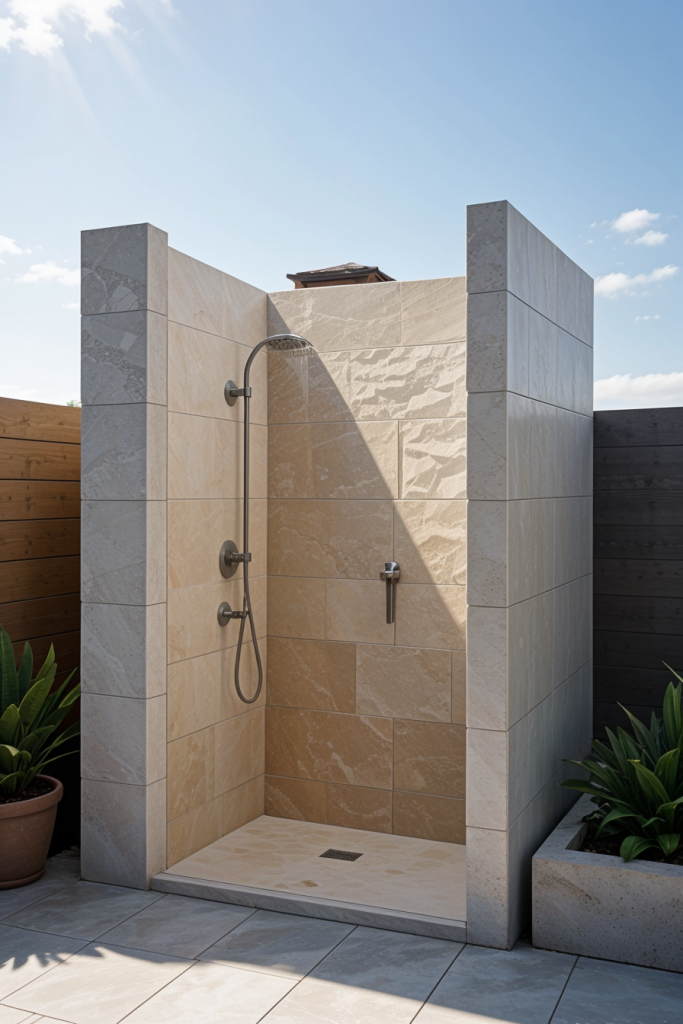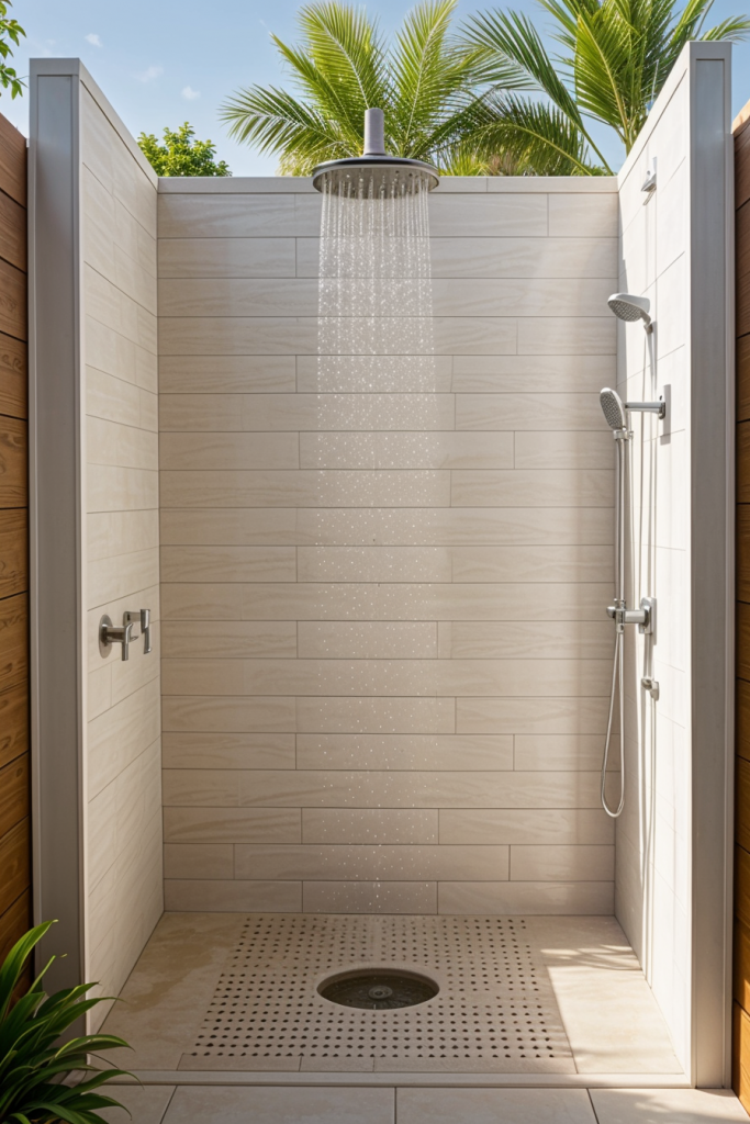 It is extremely important to have the right enclosure for both privacy and design in your outdoor shower. This design incorporates contemporary beauty with function, including glass and weather-resistant partitions to create a stunning private space. You get the best of both worlds: a balanced retreat that is relaxing and modern at the same time.