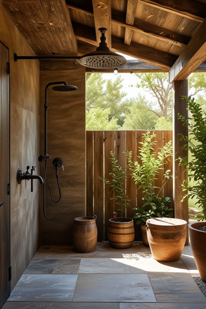 Rustic outdoor shower designs capture nature’s beauty through organic textures, antique hardware, and nature-inspired colors which make the space feel cozy and welcoming. Such a design combines rugged the natural world with modern conveniences and creates a stunning outdoor area with lasting appeal.