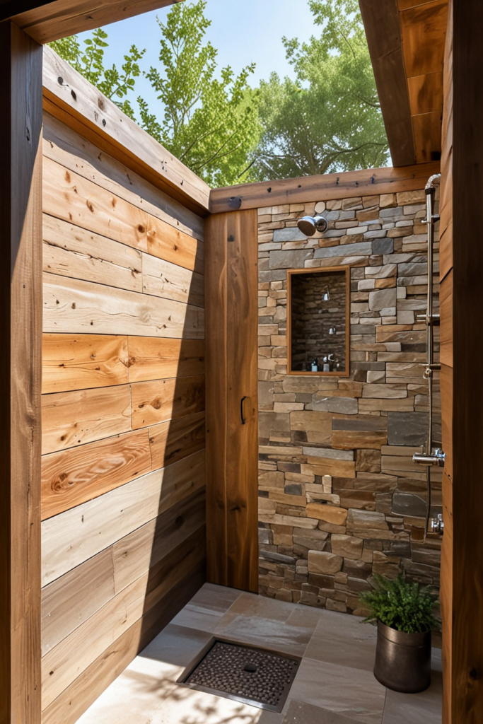 Incorporating reclaimed materials into an outdoor shower adds a unique sustainable touch. Unlike traditional designs, this style showcases aged wood, repurposed stone, and weathered metal which exude warmth and rustic charm, blending effortlessly with modern features.
