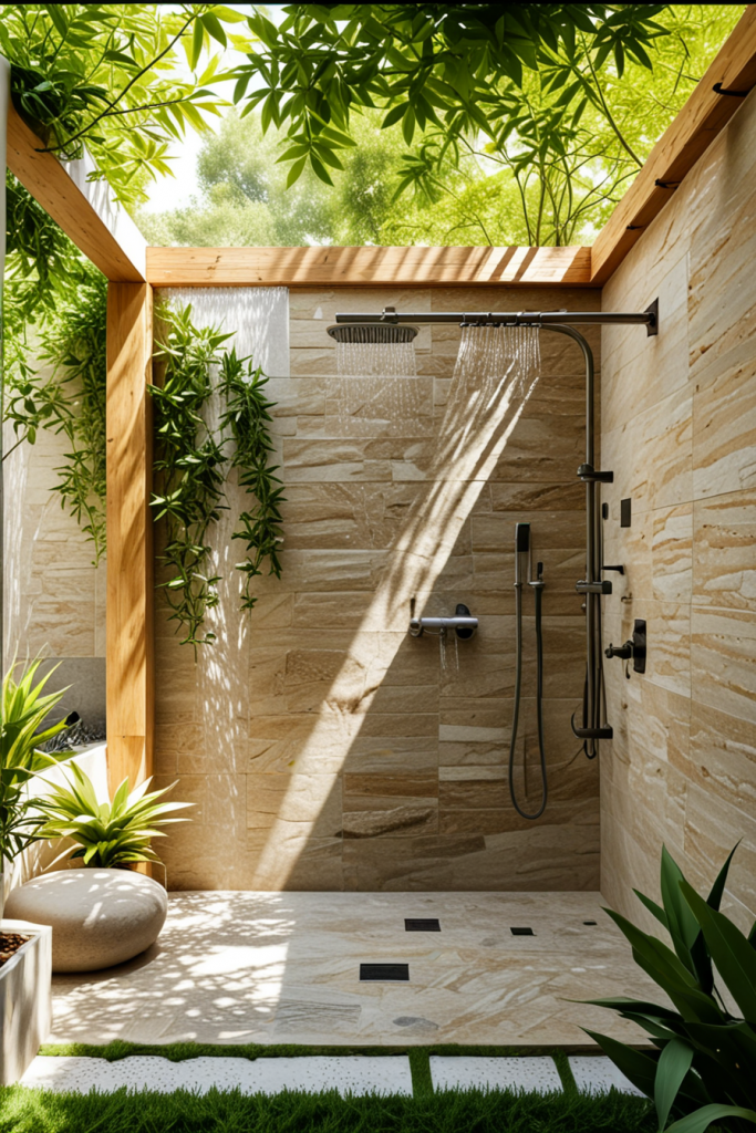 Incorporate summer outdoor shower designs that take eco-friendly materials and water-saving techniques into consideration. The design incorporates the use of recycled and renewable materials as well as efficient fittings to create a shower that is modern and gentle on the environment. With such practices, you can have a lavish shower experience while doing good for mother nature.