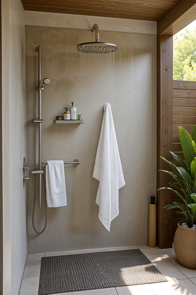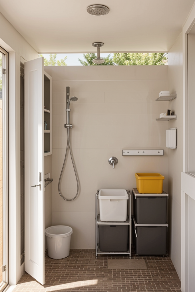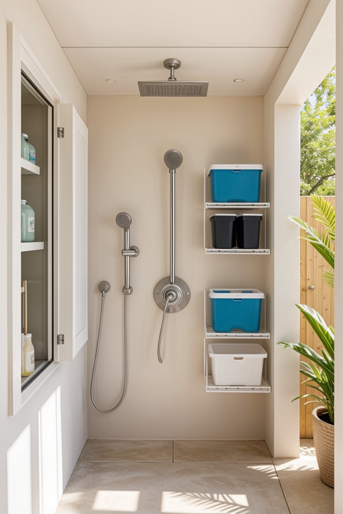 An outdoor shower can be effortlessly kept tidy with smart storage solutions that combine handiness with stylish design. This system of design removes all shower accessories with the use of concealed cabinets and waterproof storage bins which match modern decor. Everything blends into the decor while still remaining practical.
