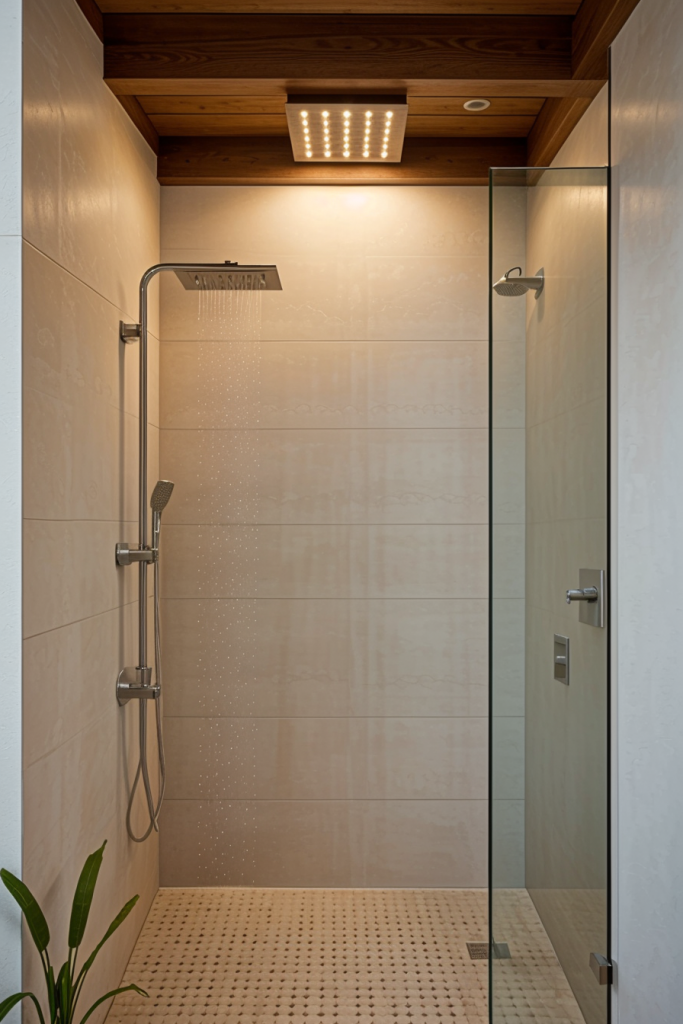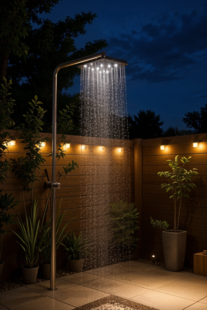 The unique lighting design turns your outdoor shower into captivating retreat after the sun has set. The design incorporates LED strips, spotlights, and ambient lighting that offers both safety and beauty encouraging relaxation during the evening hours.