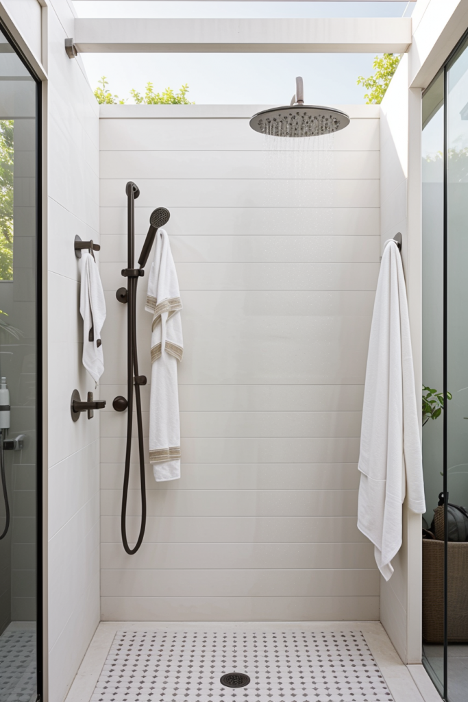 With the right accessories your outdoor shower experience will be even more stylish and layered with restfulness. Incorporate waterproof art, ambient lighting, and designer towel racks to further enhance your outdoor shower ideas. These details help in functioning practicality and sophistication into your shower buffer zone.