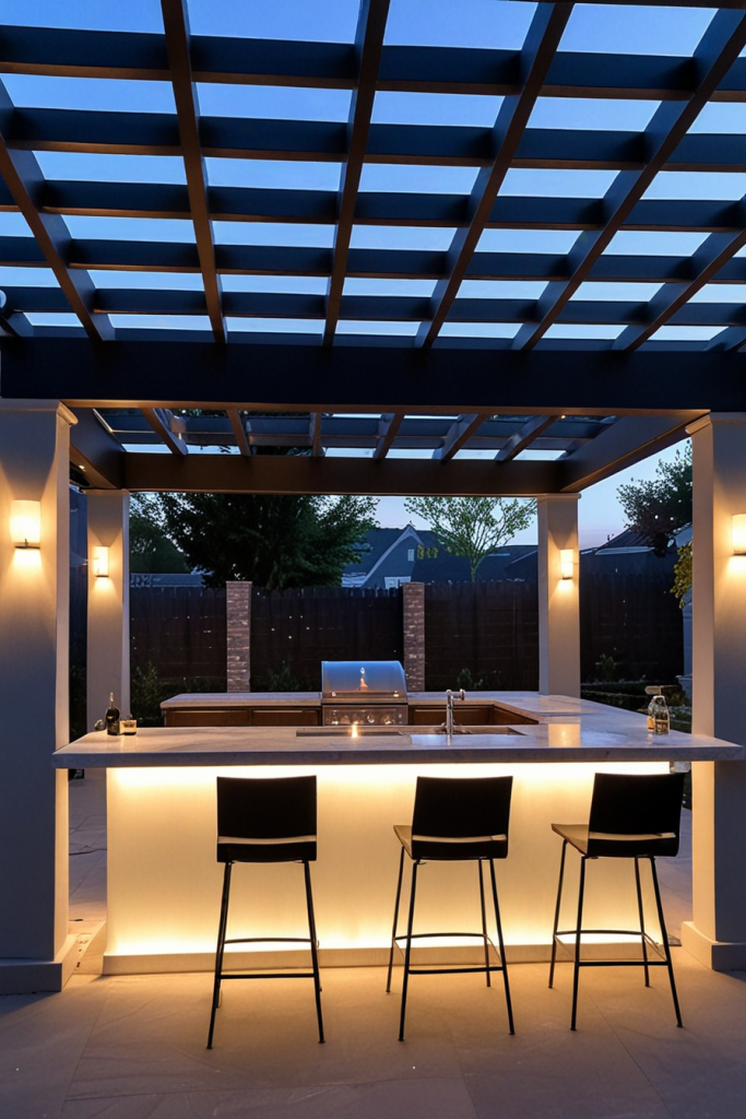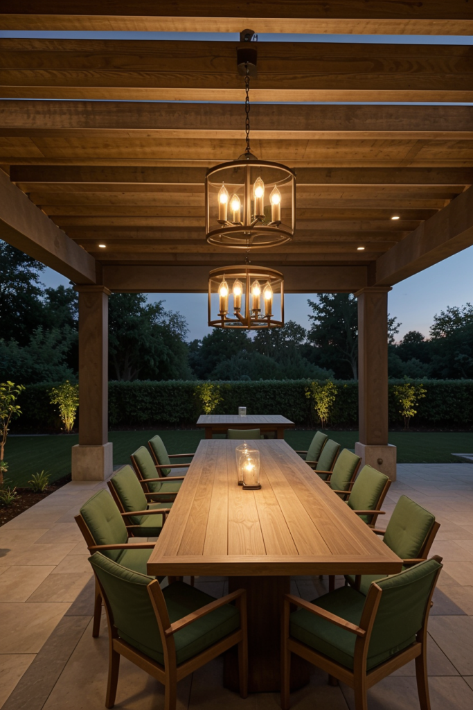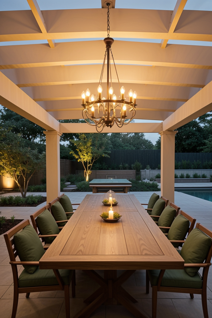 Having meals under a pergola becomes a luxurious experience when enhanced with remarkable lighting. Imagine having an elaborate table below glass or metal light sculptures hung above. Think oversized lanterns, geometric chandeliers, or minimalist pendants in brushed gold or matte black. The use of stone or polished teak also adds to the dining surface’s elegance aesthetic while refined outdoor chairs with upholstered cushions add to the geared utmost comfort. This luxurious setup is ideal for intimate gatherings that deserve an inviting atmosphere, including summer parties.