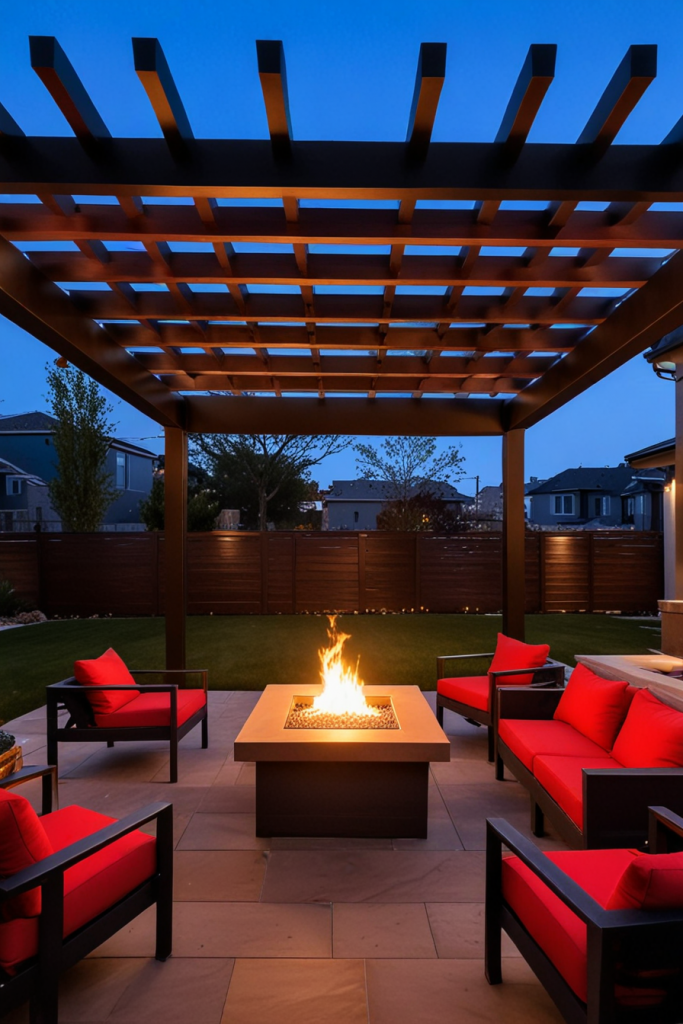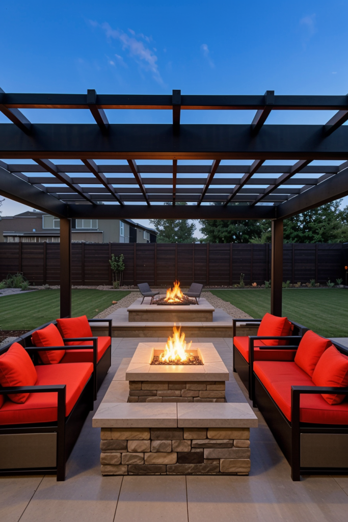 Incorporating a fire pit into your pergola area improves its aesthetic appeal and purpose. The fire feature of these pergolas is often linear and gas-powered, set in the middle of black steel or dark-stained wood, which are used as the bordering geometry. Place modular sofas made of performance fabrics alongside the fire, adding glass windscreens. It is an elegant summer evening setting for design connoisseurs.