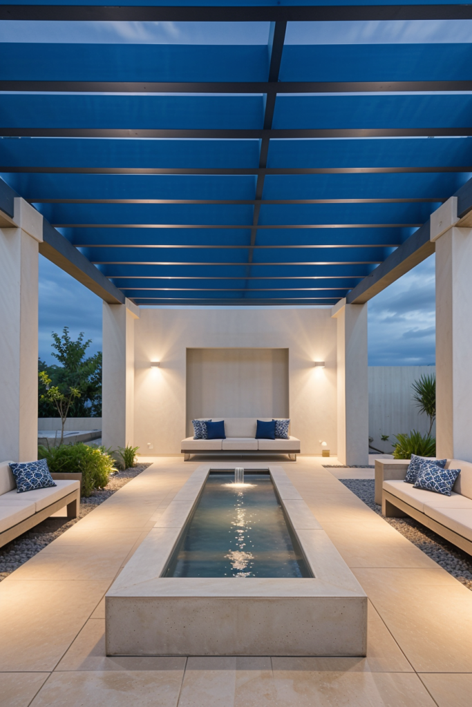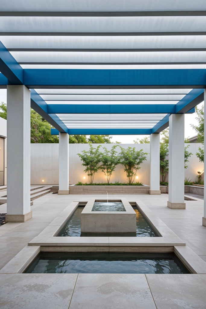The addition of a subtle water element boosts relaxation to a pergola. A long reflecting pool, slender wall fountain, or even a contemporary basin all add soothing motion and sound without overwhelming stillness. Position low sofas or chaises next to the pergola. PGardens Featuring black stone, brushed steel, or matte concrete polished the modern look of the structure.