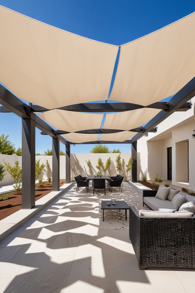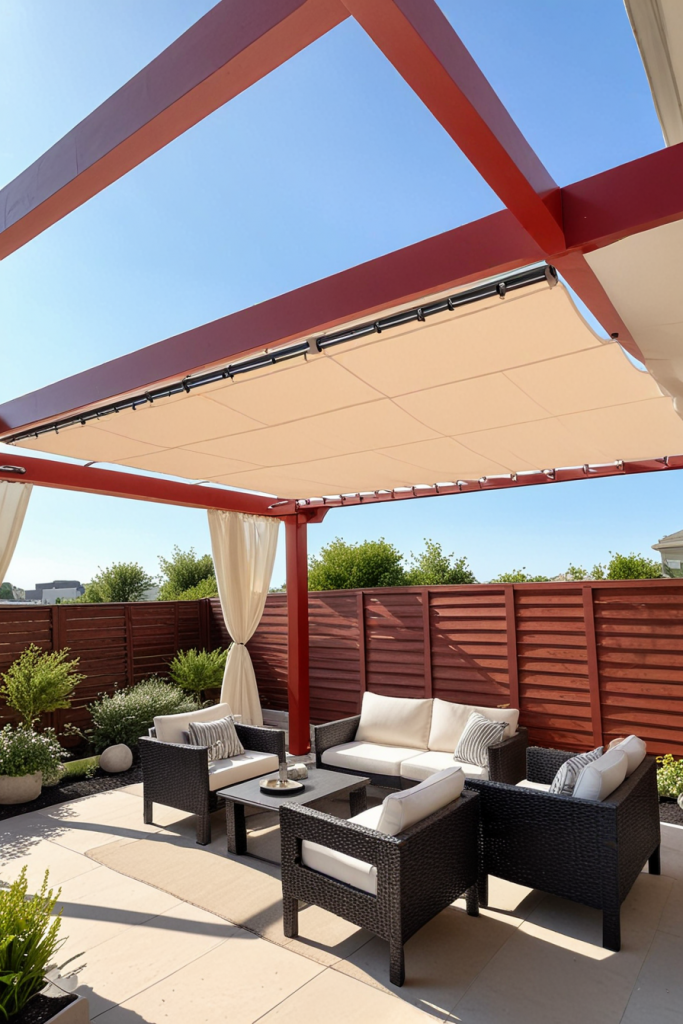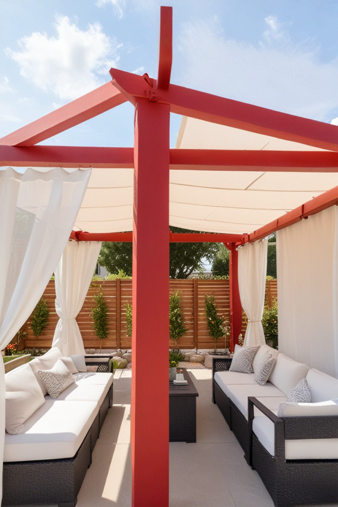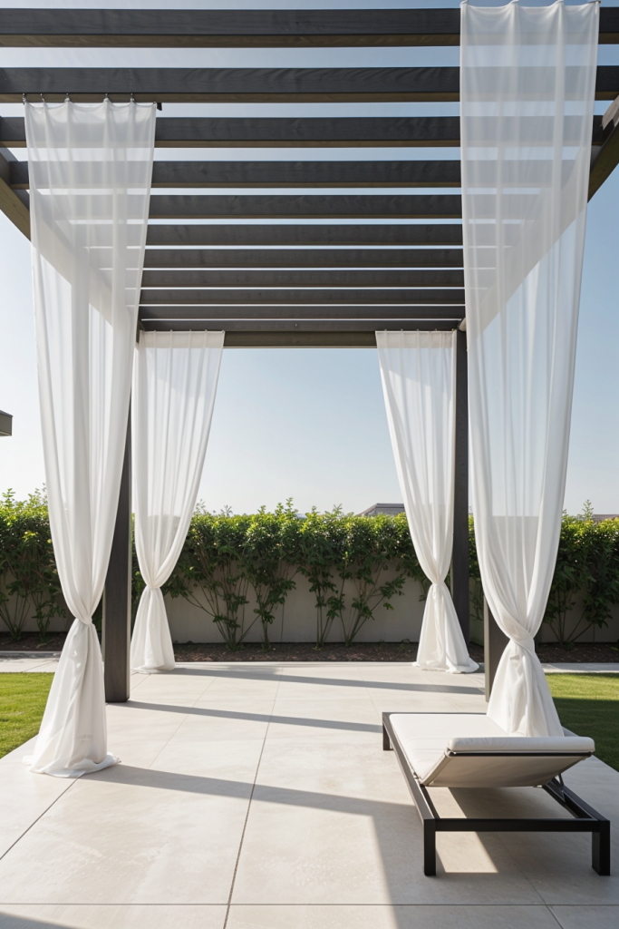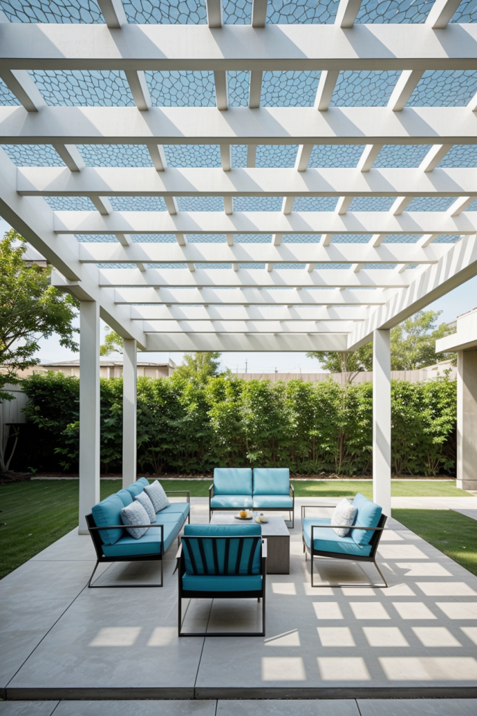 Some pergolas have laser-cut metal panels, sails, curved wood slats, or even fabric sails as sculptural shade elements instead of traditional beams. These sculptural elements are more than functional; they transform the overhead structure into an swathe of art that delights the eye as it changes with light throughout the day. You can let the structure shine by limiting furniture to minimal designs, or you can use bold accents like a statement table to echo the creativity above.