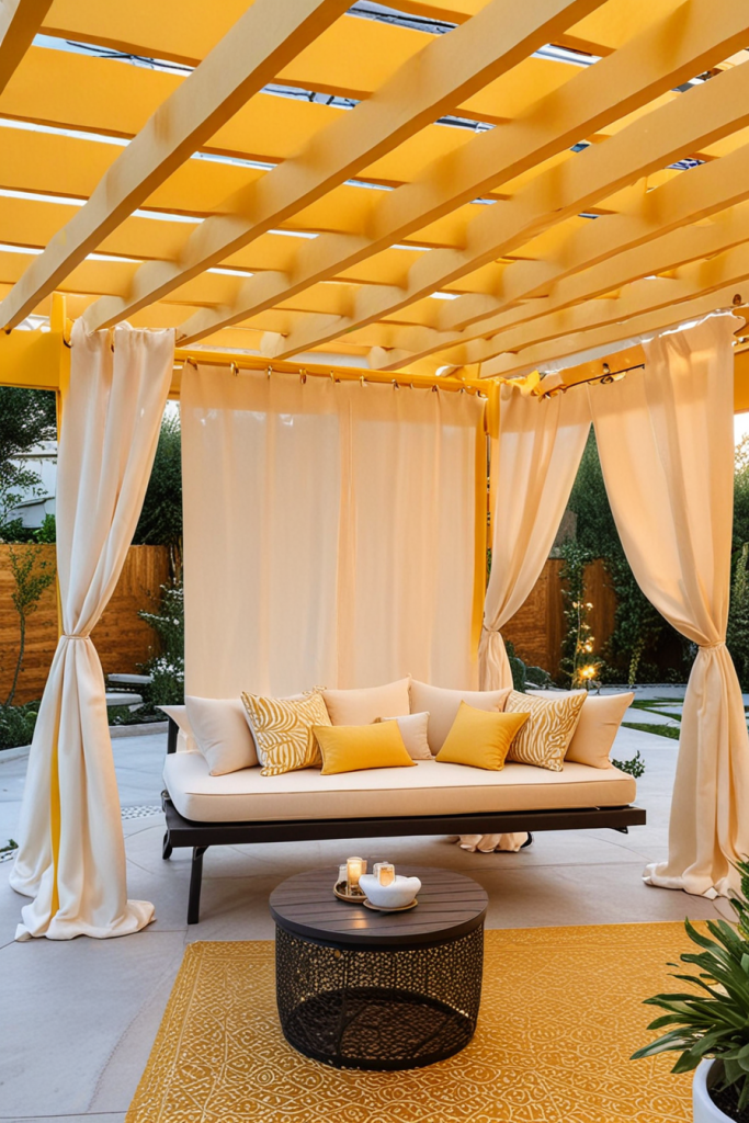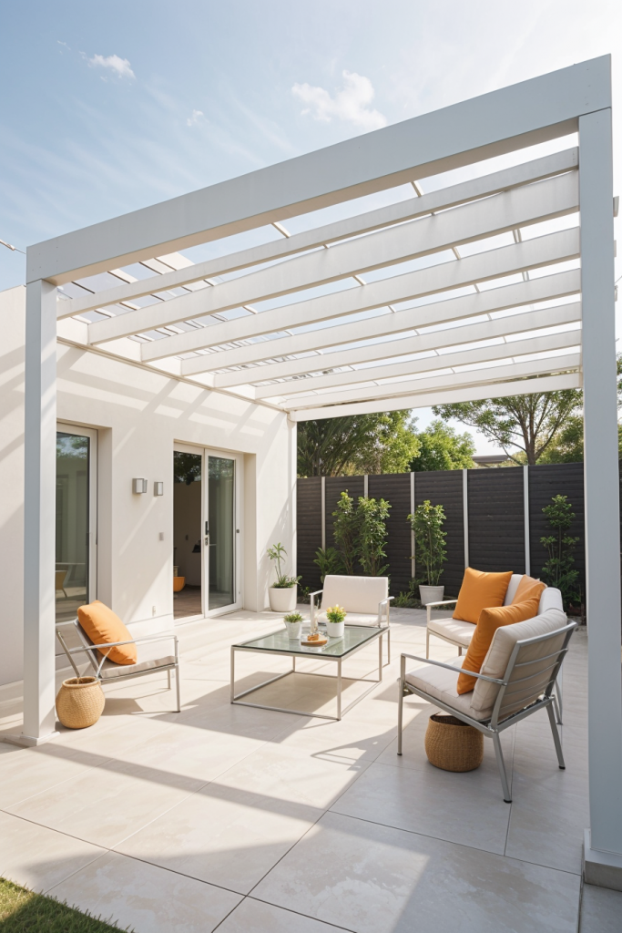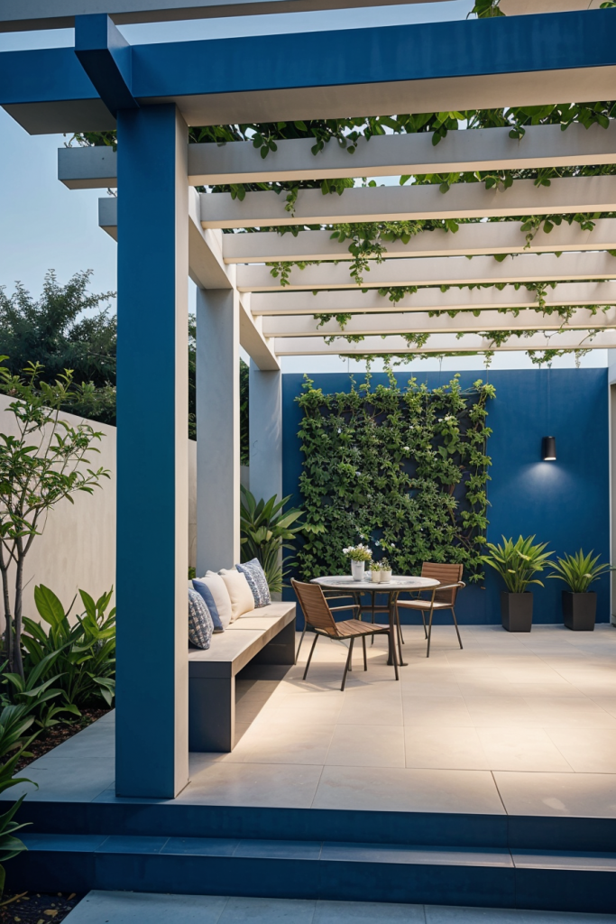 When combined with white, gray, or taupe tones, monochromatic colors within pergola spaces evoke a soothing feeling while maintaining balance. Such designs usually incorporate flooring, furniture, and decor with the same color including subtle differences in texture to make it visually appealing. Incorporating soft metallic or glass details improves the overall look. This design works particularly well in contemporary gardens, rooftops, or patios that prioritize understated refinement.