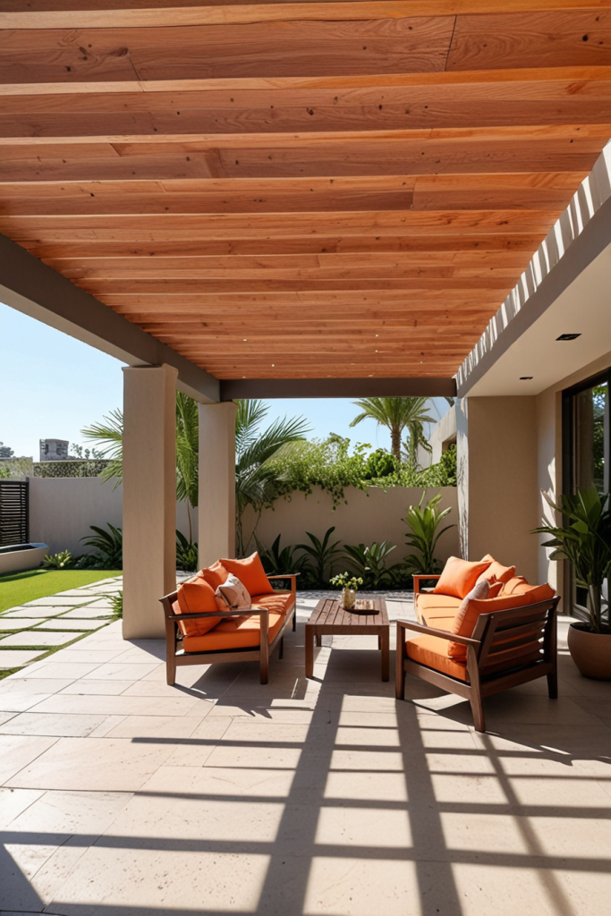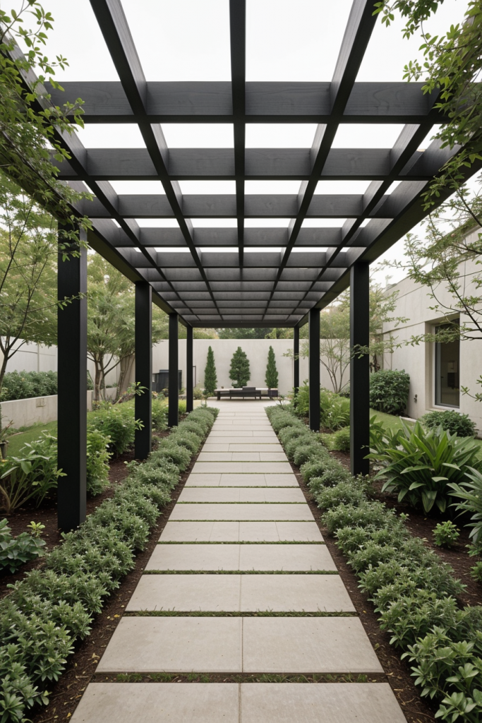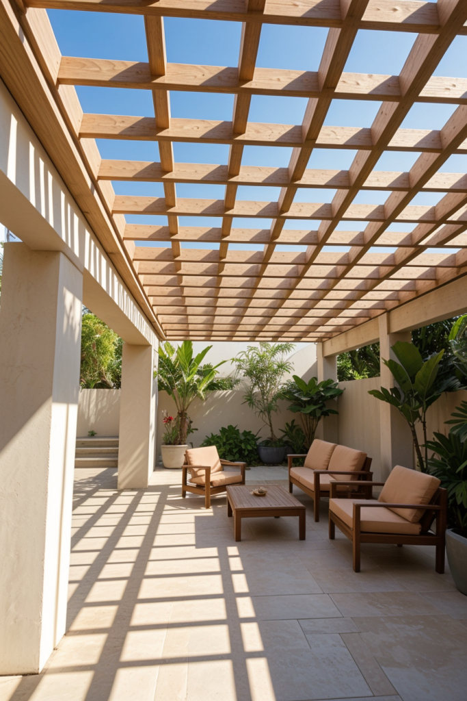 Slatted wooden ceilings combine light and shade perfectly. These pergolas filter sunlight into artistic shapes while allowing airflow—important in hotter regions. The slats can run parallel or cross each other in geometric designs, usually accompanied by a light vertical base and dense foliage. This design is for those who wish to achieve a gentle, airy feel without sacrificing order.