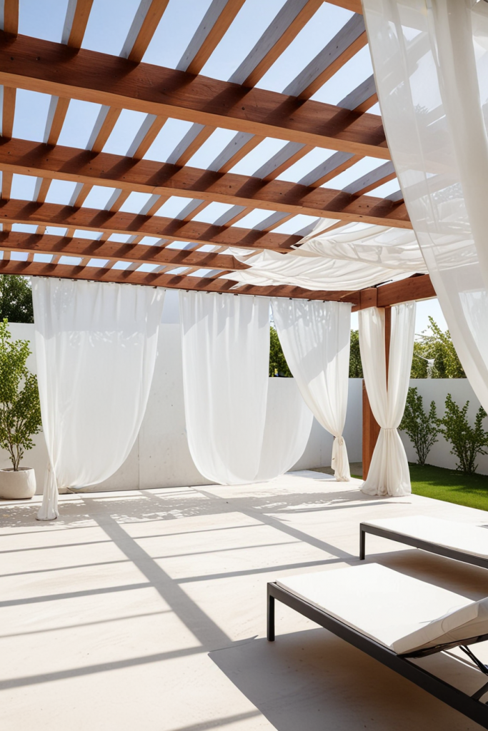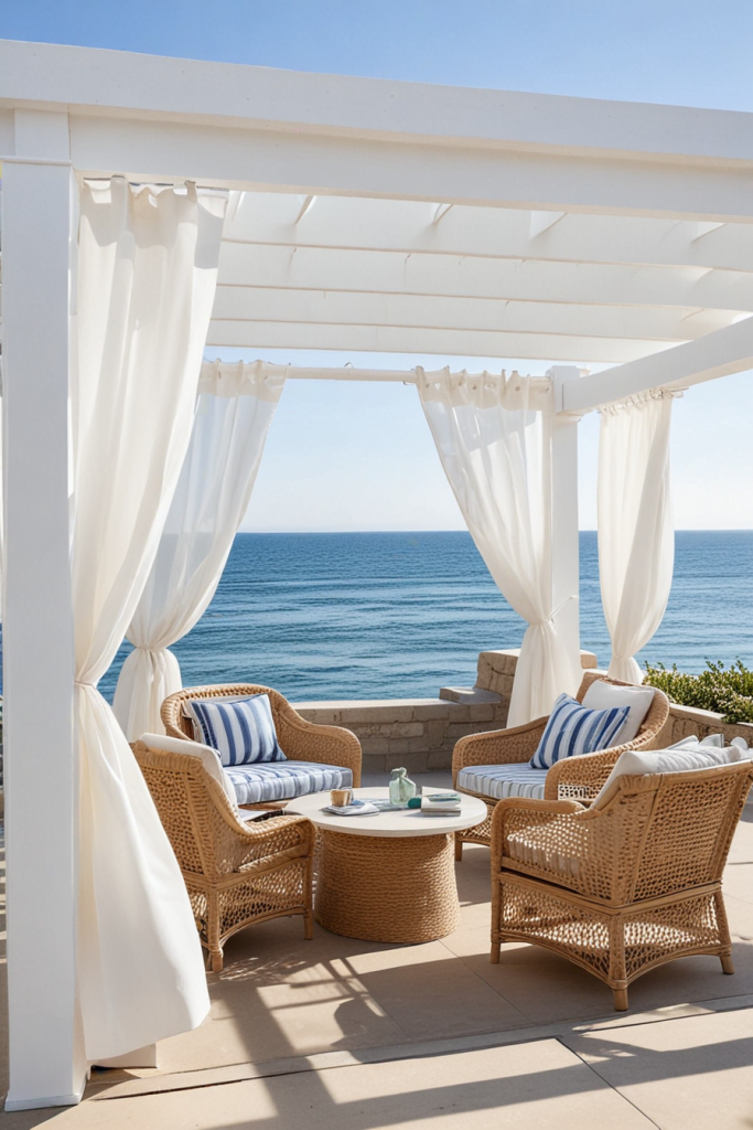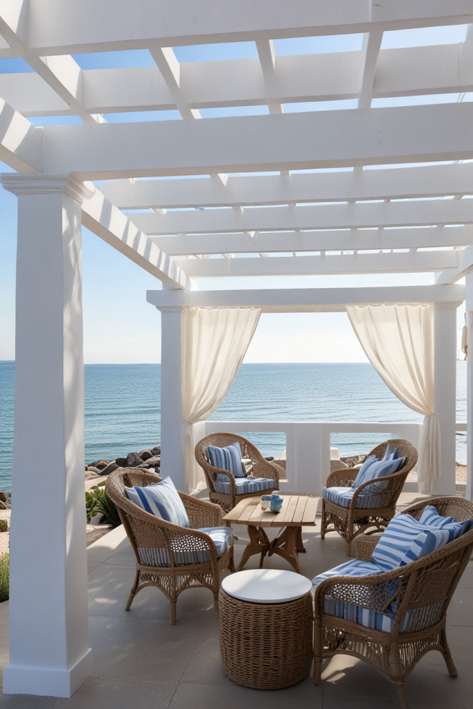 There’s something about a white pergola that transports one to a coastal paradise. Suited for patios overlooking the sea or a pool, this style usually incorporates rattan, lightweight cotton fabrics, and other elements from the ocean. Picture whitewashed beams, deck wood in soft hues, and accent cushions with navy stripes alongside soft, sheer curtains. It’s easygoing sophistication appropriate for homes by the ocean or nautical-themed gardens.