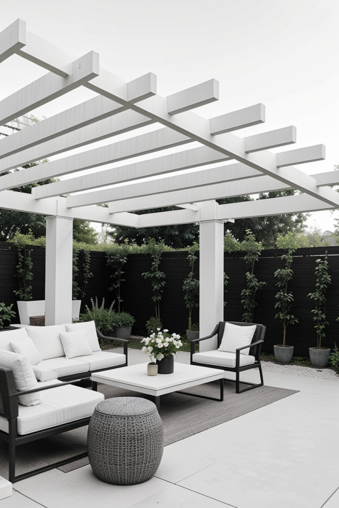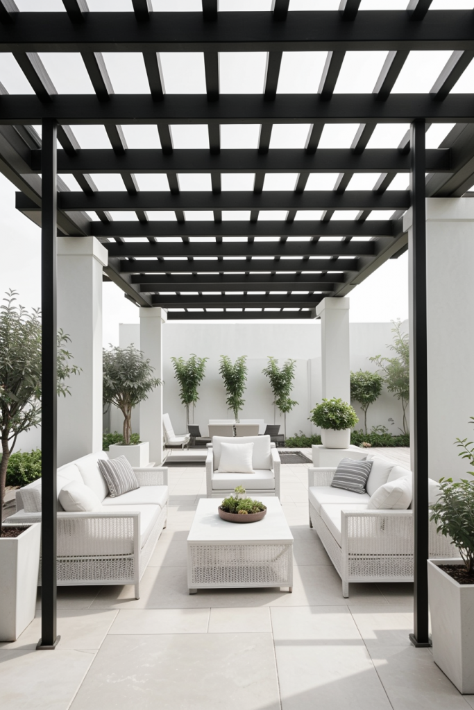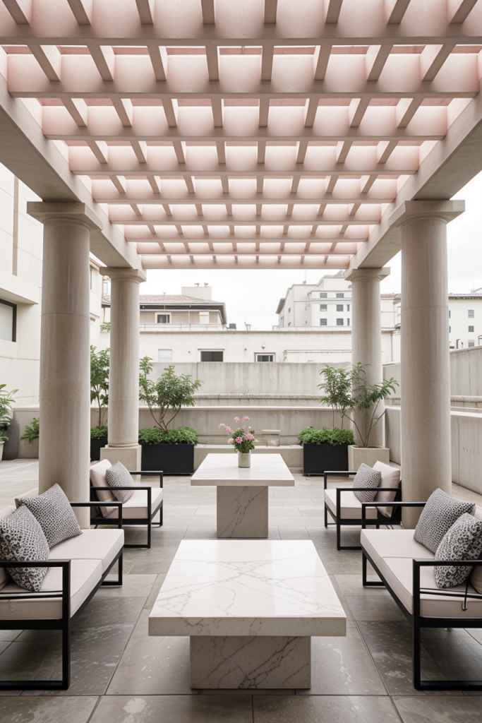 For an upscale aesthetic, place pergola structures alongside marble or concrete pieces. Marble and concrete woven flooring, alongside concrete pillars and table tops, exude a sense of sophistication. These pergolas utilize sculpted furniture set in monochrome—white, grey, or charcoal—blending it with a color palette of their choice. The resulting image is profound yet refined, perfect for modern urban courtyards or high-end patios in need of a stylistic centerpiece.
