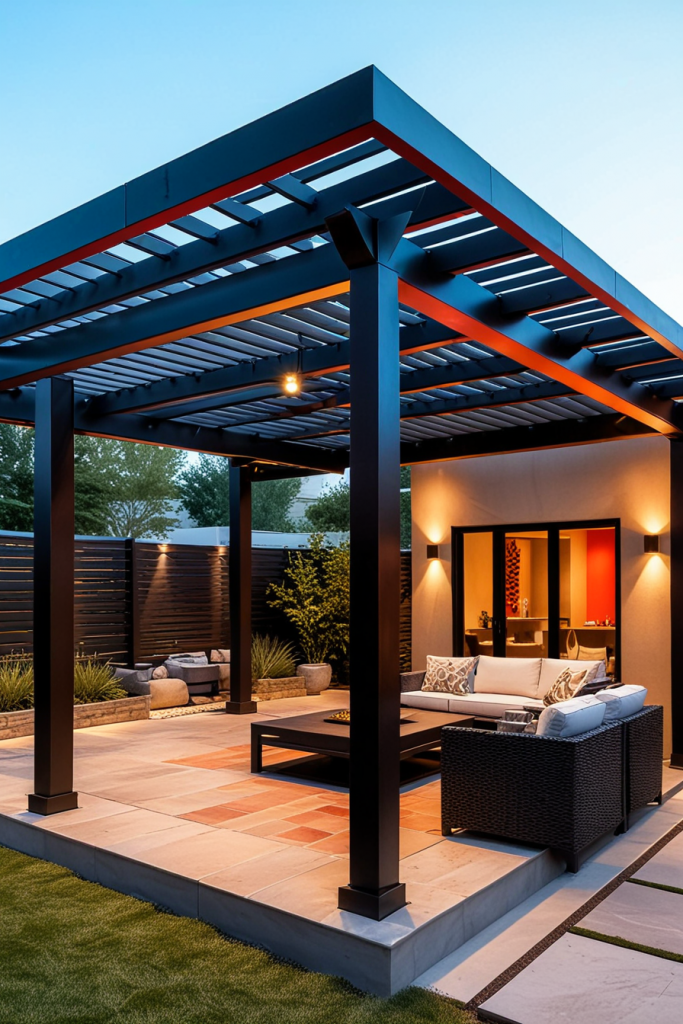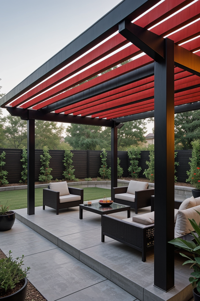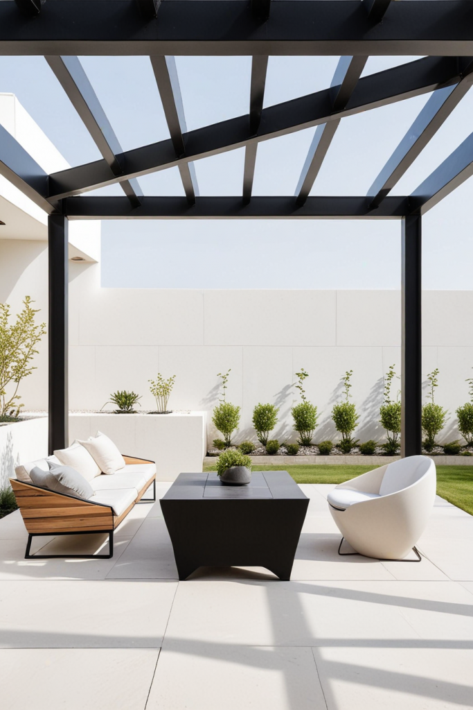 The black, steel framed pergolas are quite interesting when it comes to architectural design. The sharp lines and blunt shapes black metal and powder-coated aluminum create are perfect complements to posteriormente styled houses. They can also be paired with light pavers, gravel, or wood for extra pizzaz. Plain, sculptural, and sectional sofas work better with the described setting and result in a balanced space that is appealing, sophisticated, and unobtrusive at the same time.