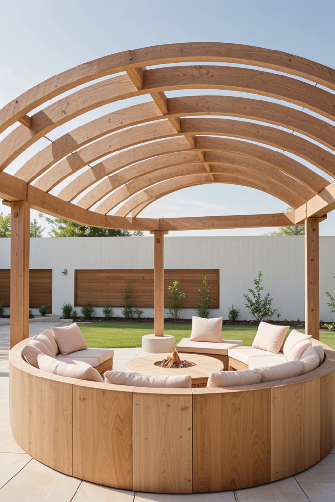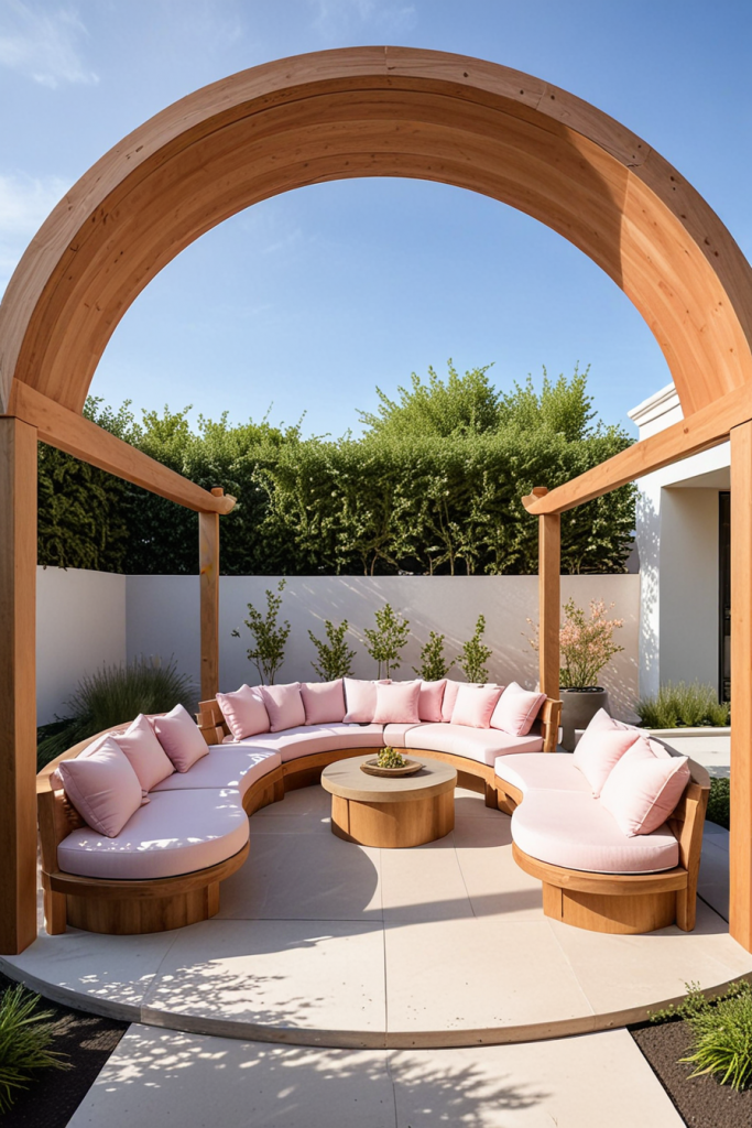 A departure from the conventional angular shapes of pergolas, curved designs add fluid movement and beauty to the outdoors. These structures can either arc like a wave over a space or wrap around seating areas in a gentle crescent. The use of steam bent wood or powder coated aluminum gives these structures a sculptural and sleek quality. For a cohesive look, combine these with circular dining sets or rounded sofas which emphasize softness and flow.