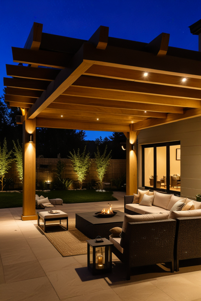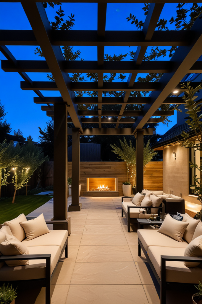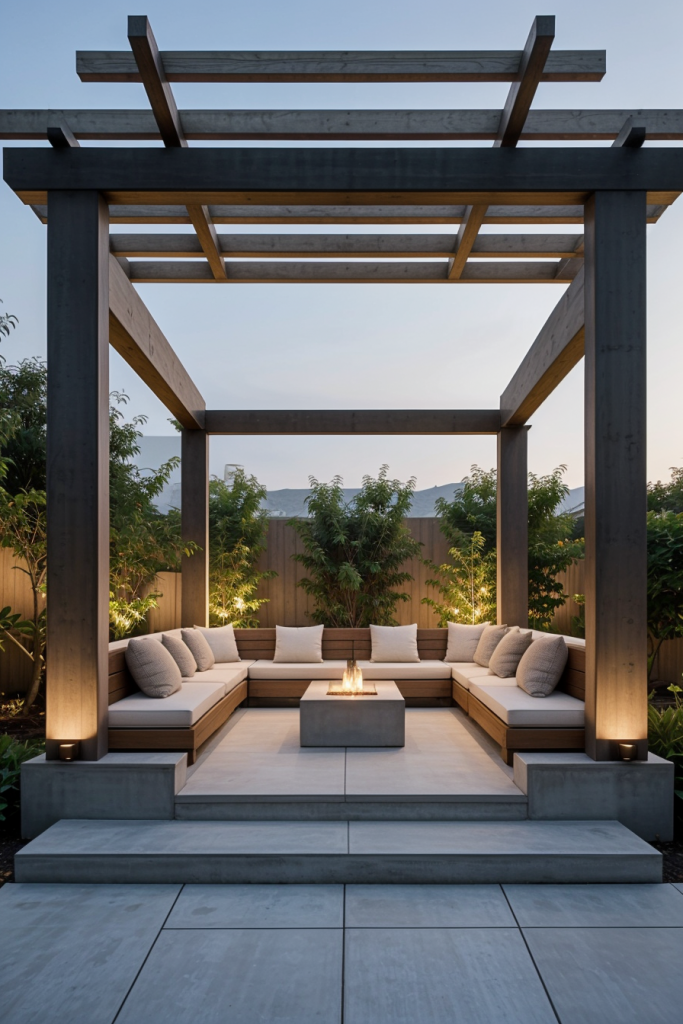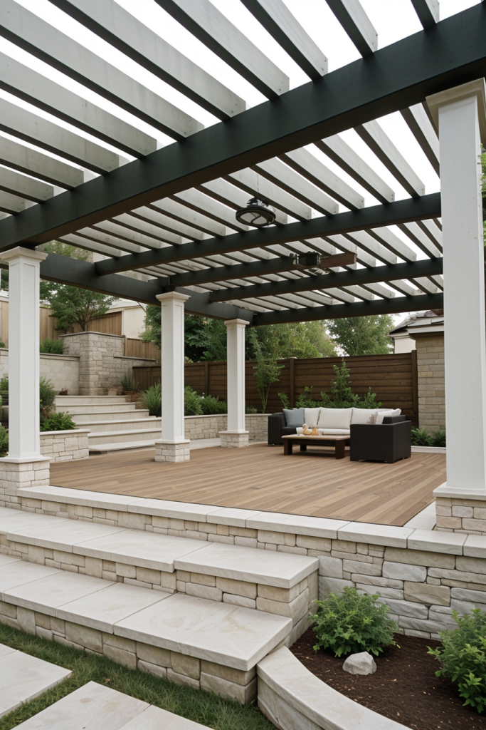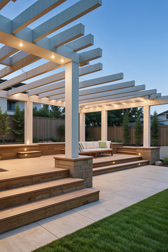 The addition of tiered flooring underneath a pergola allows for greater stratification while simultaneously adding structure to the different regions for lounging, relaxing, or dining. Furnished domain of tiered wood and smooth concrete, inset stone may also be added to increase interest through layering. Planters along with built-in step enhances three-dimensional layout. Such structure is magnificently suited to sloped terrain or multifunctional outdoor areas where sophistication meets creativity.