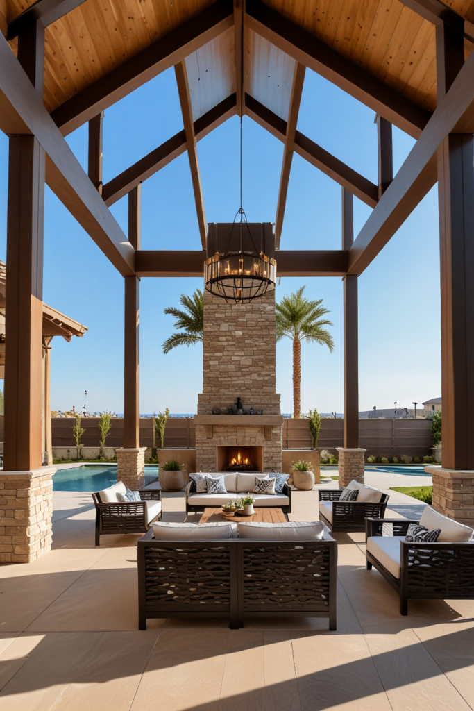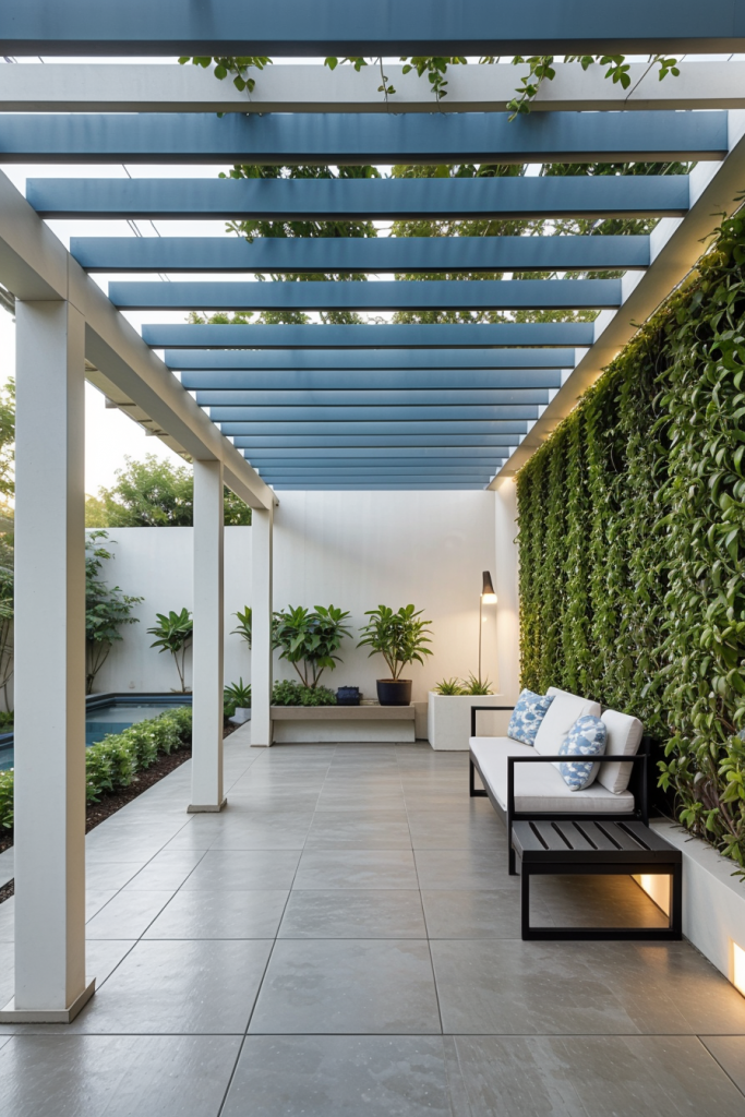 Vertical gardens infuse elegance and a refreshing vibe to rigid pergolas. These pergolas include living walls composed of herbs, succulents or ferns, which act as both natural privacy partitions and centerpieces. The greenery provided along with the neutral stone or tile flooring and modern furniture creates a streamlined design and enhances the connection to nature. . A feature like a water fountain or a bench infront of the green wall further enhances the serene atmosphere.