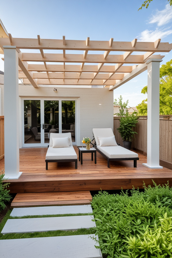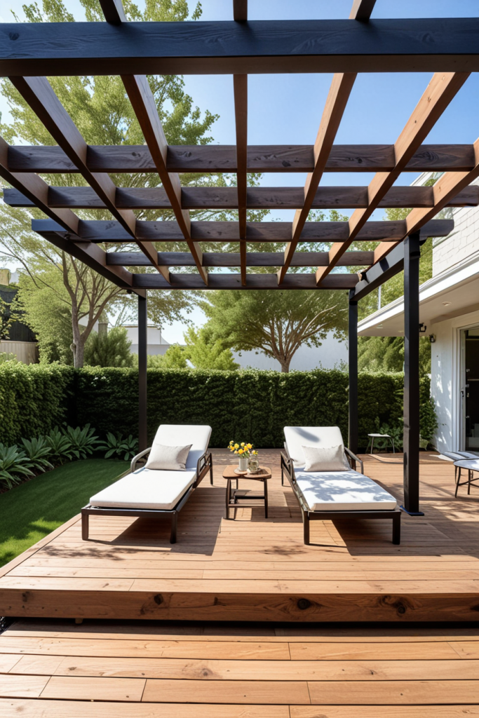 Floating deck pergolas are a stricture designed for enhancing your lounging experience- quite literally. These structures take the form of wooden or composite platforms which offer ample space for relaxation, reading, or sunbathing while simultaneously featuring a frame for a pergola. Install a small table and a couple of outdoor chaise lounges and soft throws to enhance comfort. Use gravel or trimmed grass to border the deck for a clean finish. This design feels refined, exceptionally airy, and summer-ready.