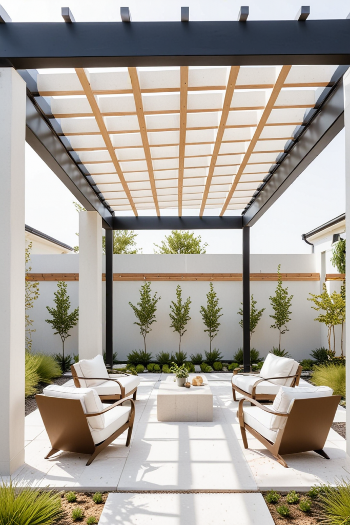 The best Minimalist pergolas highlight elegance, spatial reasoning, and clever proportioning. You will notice clean lines and subdued colors contrasted with exposed aluminum, composite wood, or cement bases in the construction. When coupled with contemporary furniture like low-profile loungers and floating benches, the pergolas assume a modernistic look. Optional flow with the breeze allows for the incorporation of integrated shade panels or light sheer drapes. This style caters to homeowners who treasure uncluttered design and the ability to experience unrestricted movement during warm summer months.