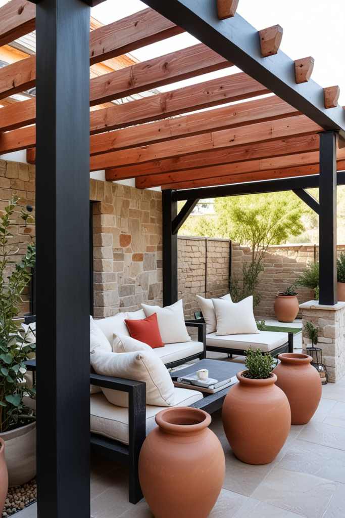 Incorporating natural textures like wood, stone, linen, and clay brings warmth and personality to contemporary pergolas. This aesthetic combines organic elements in a sophisticated manner, for instance, stone floors with teak chairs, linen cushions, and terracotta accents. This style has an effortless, timeless sensation that beckons one to pause and bask in luxurious summer afternoons.