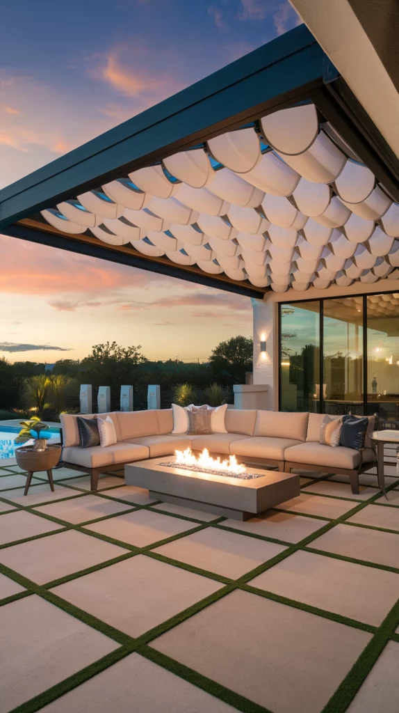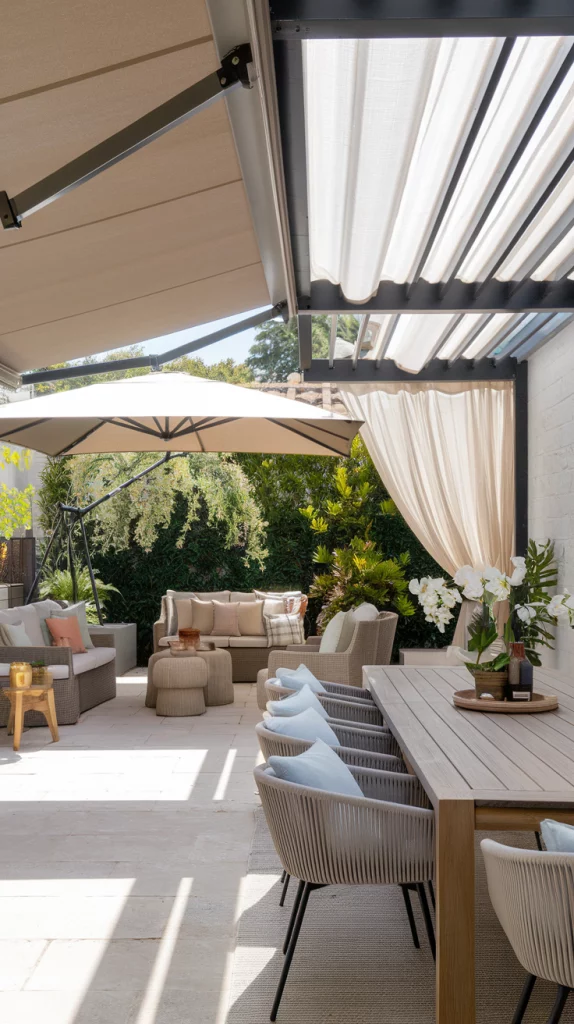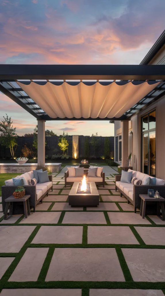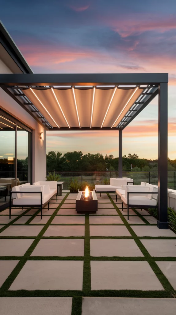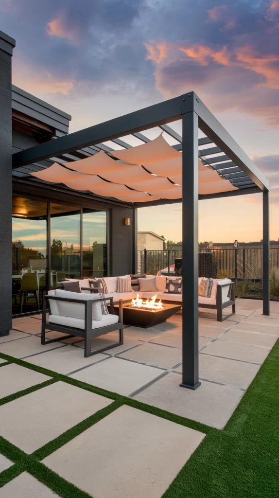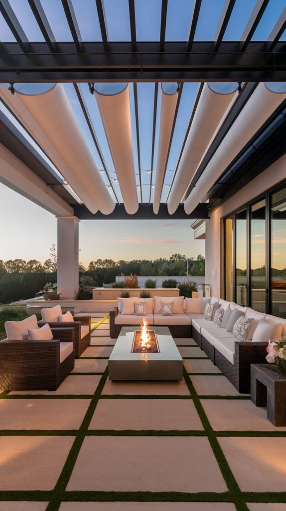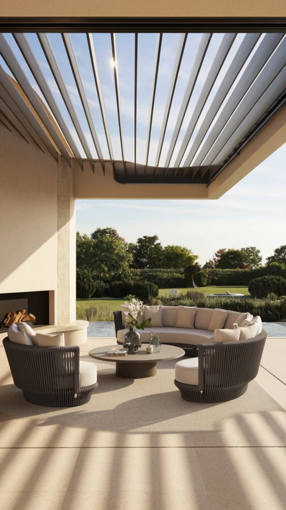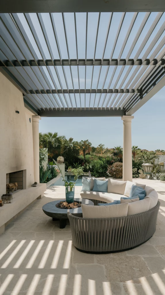 A pergola with an adjustable canopy offers a sophisticated and flexible shading solution. Whether using wood, aluminum, or steel, pergolas with sliding fabric covers or louvered roofs can adapt to different weather conditions. Adding LED lights, climbing vines, or sheer curtains enhances the ambiance, making the patio a perfect relaxation zone.