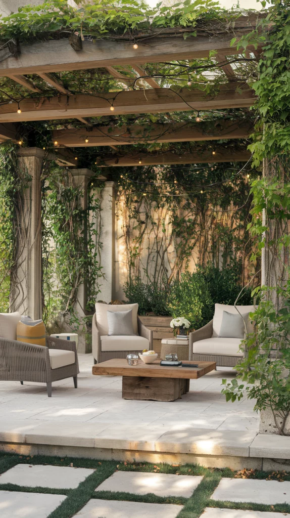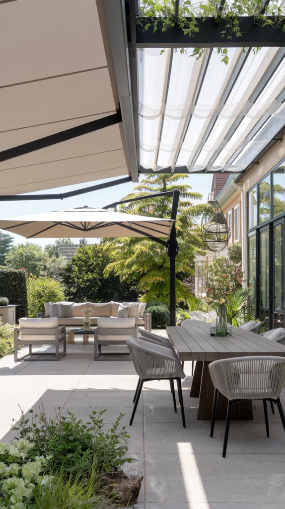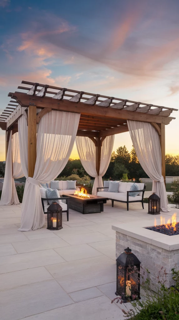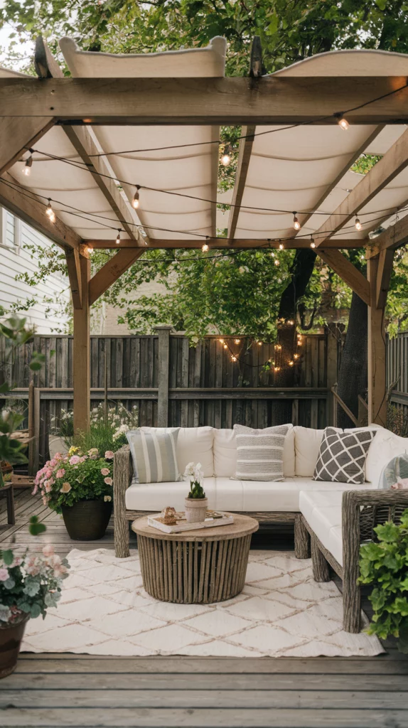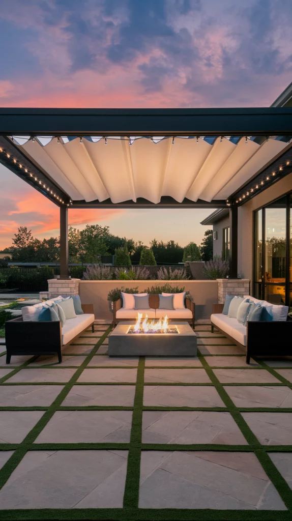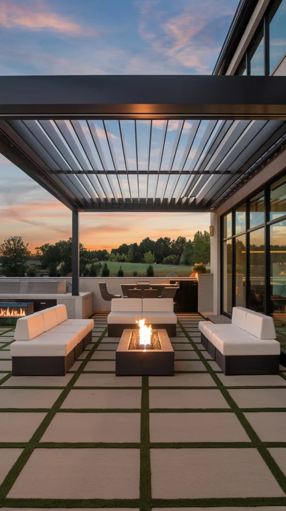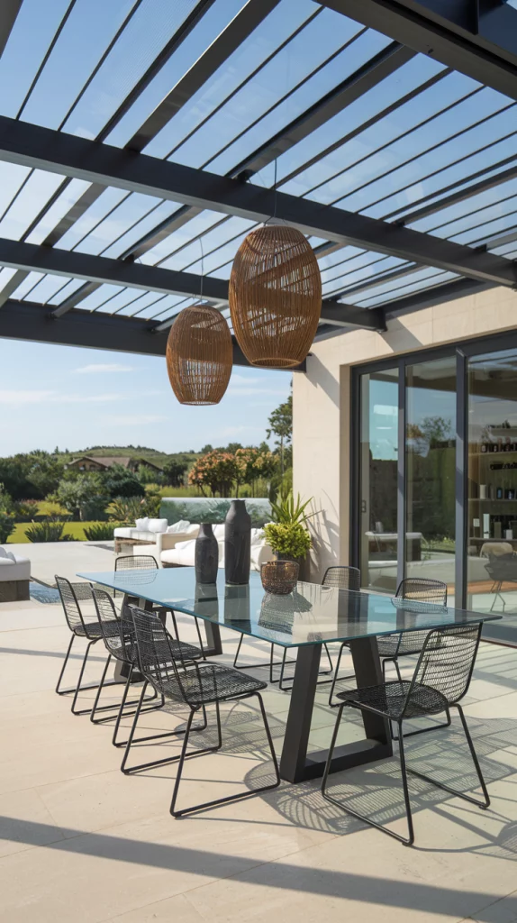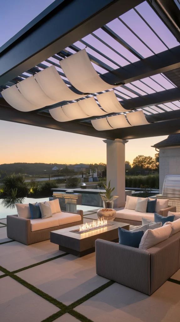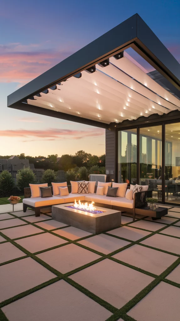 A pergola with an adjustable canopy offers a sophisticated and flexible shading solution. Whether using wood, aluminum, or steel, pergolas with sliding fabric covers or louvered roofs can adapt to different weather conditions. Adding LED lights, climbing vines, or sheer curtains enhances the ambiance, making the patio a perfect relaxation zone.
