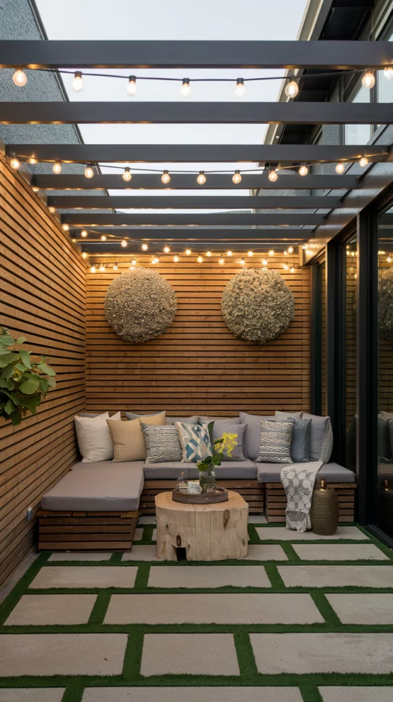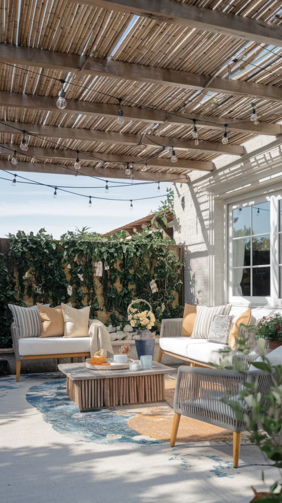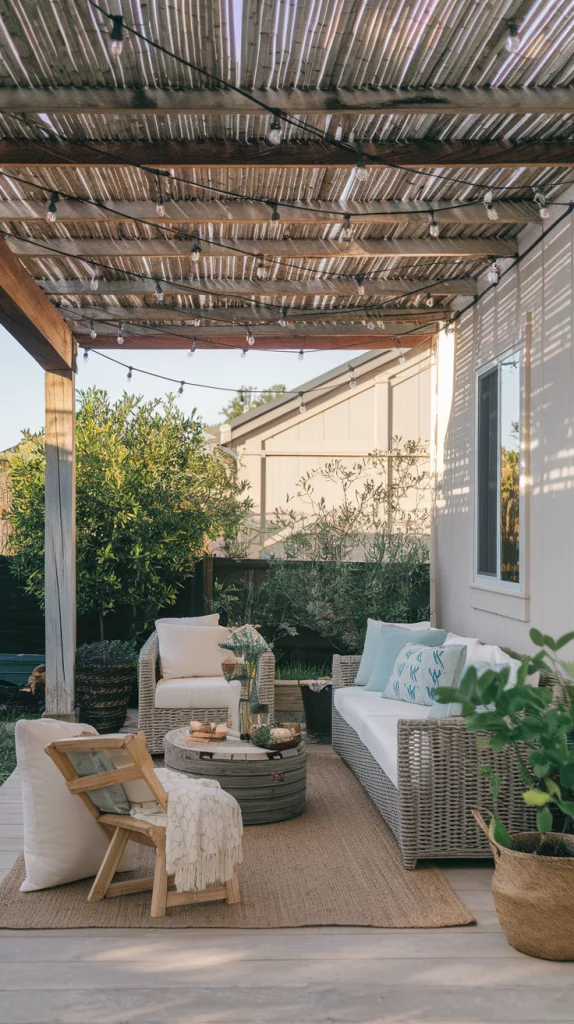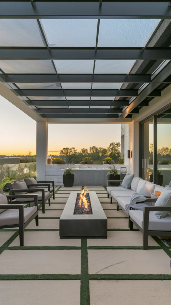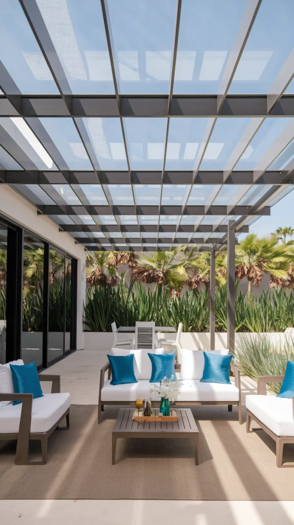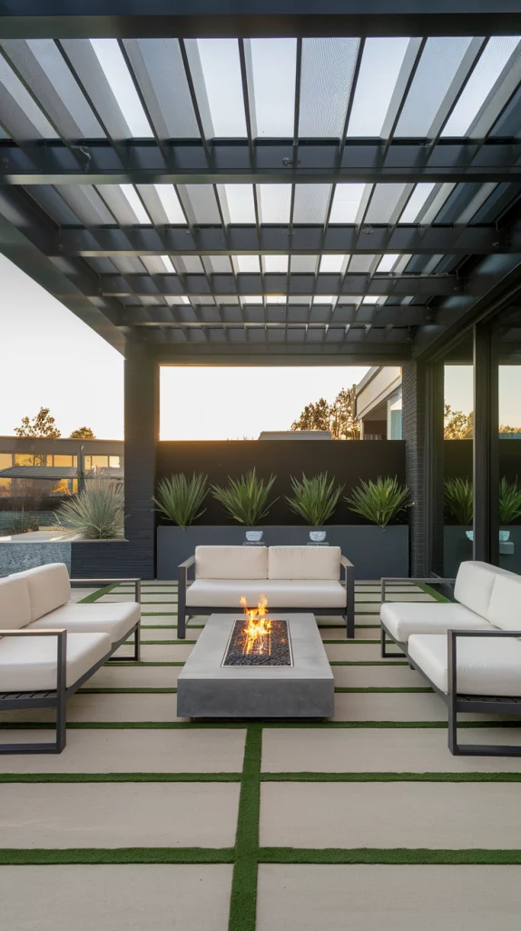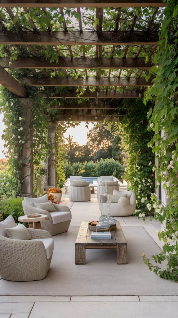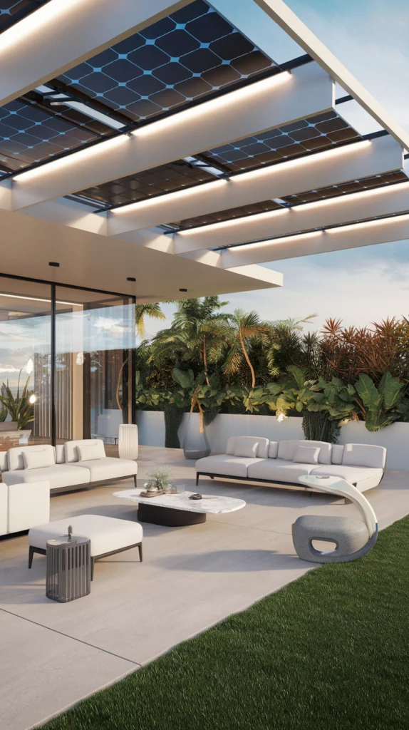 A pergola with an adjustable canopy offers a sophisticated and flexible shading solution. Whether using wood, aluminum, or steel, pergolas with sliding fabric covers or louvered roofs can adapt to different weather conditions. Adding LED lights, climbing vines, or sheer curtains enhances the ambiance, making the patio a perfect relaxation zone.