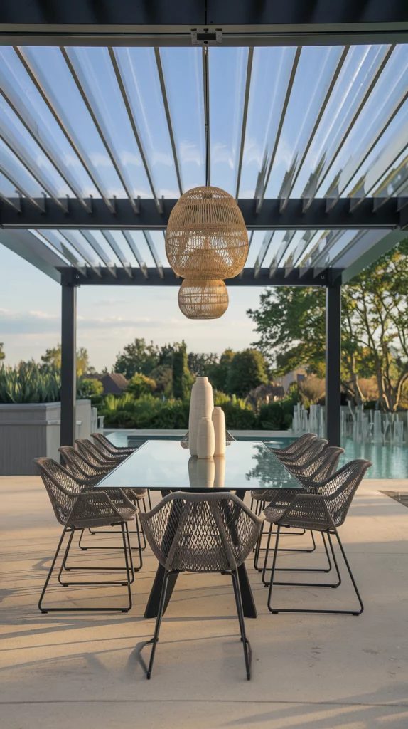 For ultimate flexibility, an adjustable slat roof (also known as a louvered pergola) provides precise sun control. The movable slats can be tilted to let in light, block the sun, or provide full coverage during rain. These motorized or manual structures create a luxury resort-like ambiance, making them perfect for high-end outdoor spaces.
